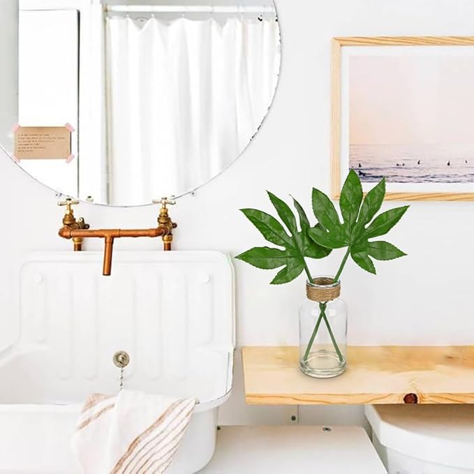 - [Premium Faux Tropical Plant] – This artificial potted plant includes 2 faux fatsia leaves displayed in a clear glass bottle vase with realistic faux water for a natural, fresh finish. Each leaf measures approx. 5.9" W x 5.5" H, carefully designed to look lifelike and elegant. The hemp rope creates a chic rustic style to this fake potted plant