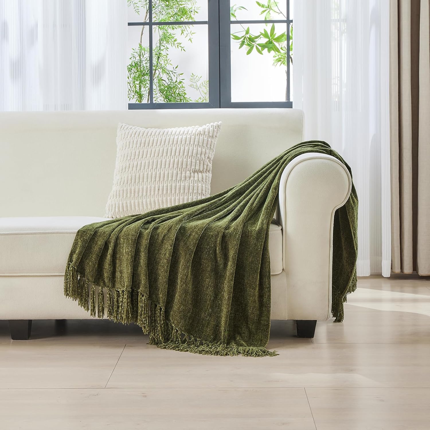 CozeCube Chenille Throw Blanket for Couch, Cozy Plush Fuzzy Decorative Olive Green Blanket with Fringe Tassels, Lightweight Throws for Bed Sofa Gift Home Decor, 50"X60"