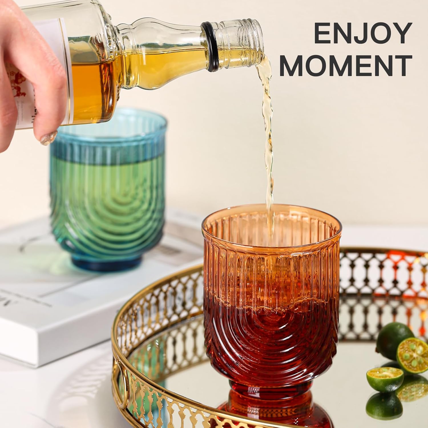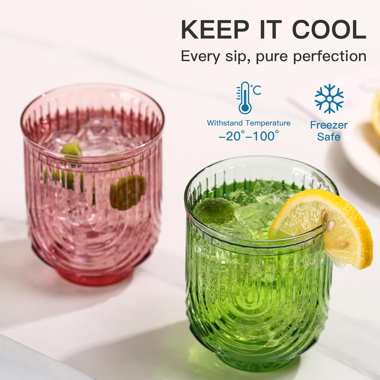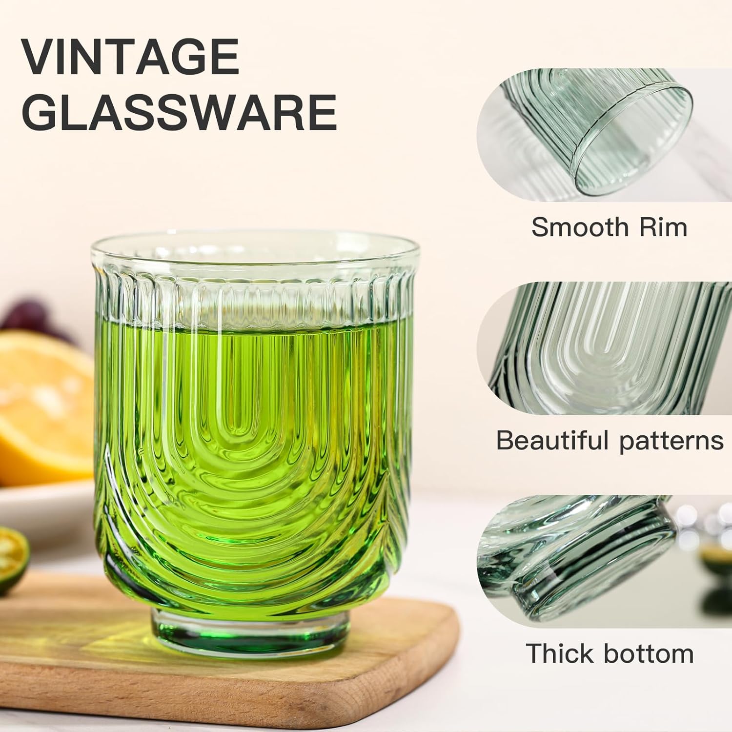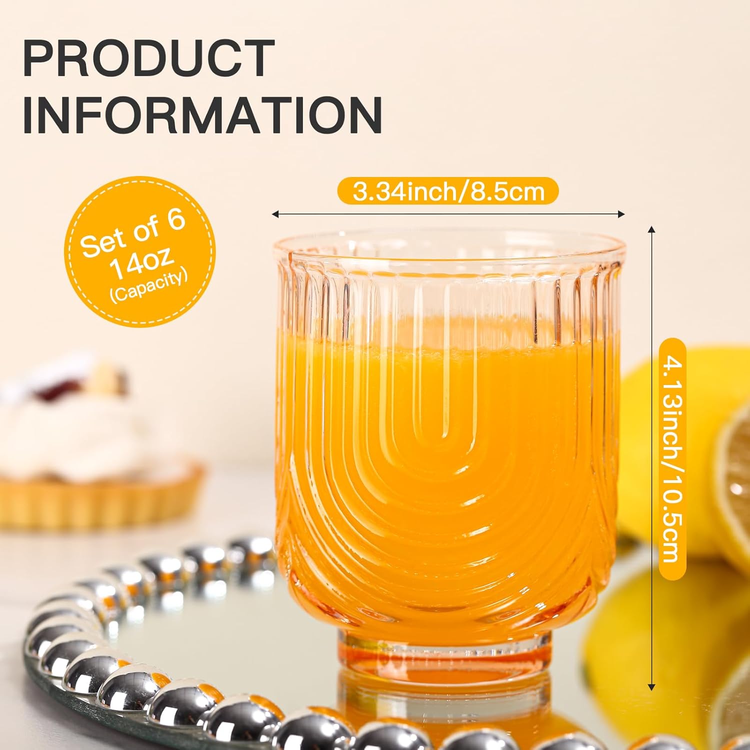 - [Elegant Arched Ripple Design] Inspired by art deco architecture, this Colored Vintage Drinking Glasses Set of 6-14Oz features a unique arched ripple texture that adds depth, grip, and vintage charm. The raised pattern gives these Art Deco Ripple Highball Glasses a distinctive appearance that elevates any table setting.