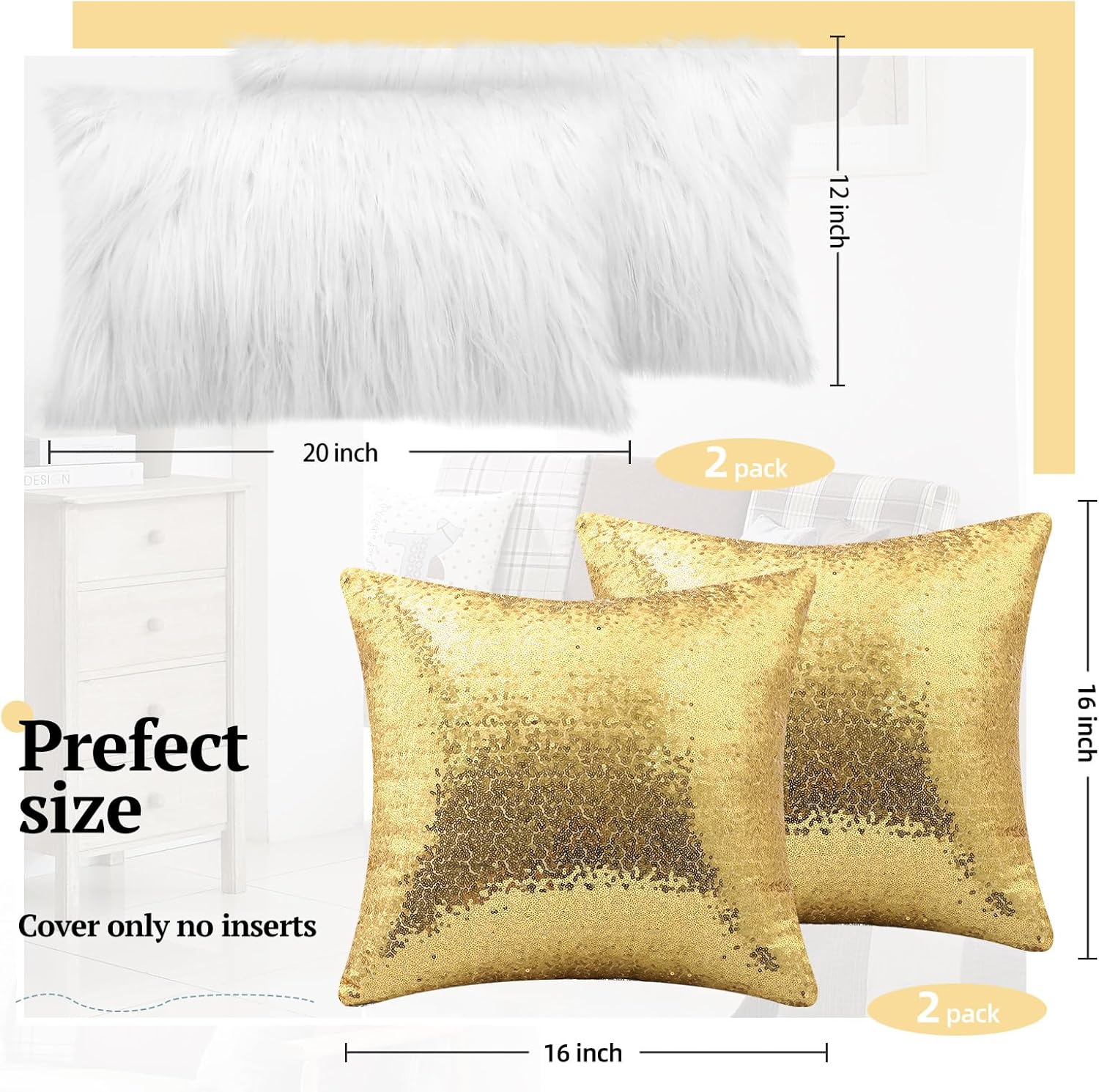 Irenare 4 Pcs Sequin and Fluffy Pillow Covers Winter Throw Pillow Cases Soft Cushion Cover for Couch Bed Sofa Xmas Day(18 x 18 Inch, 12 x 20 Inch,White, Gold)