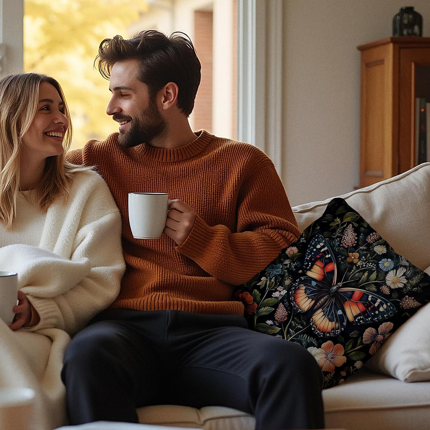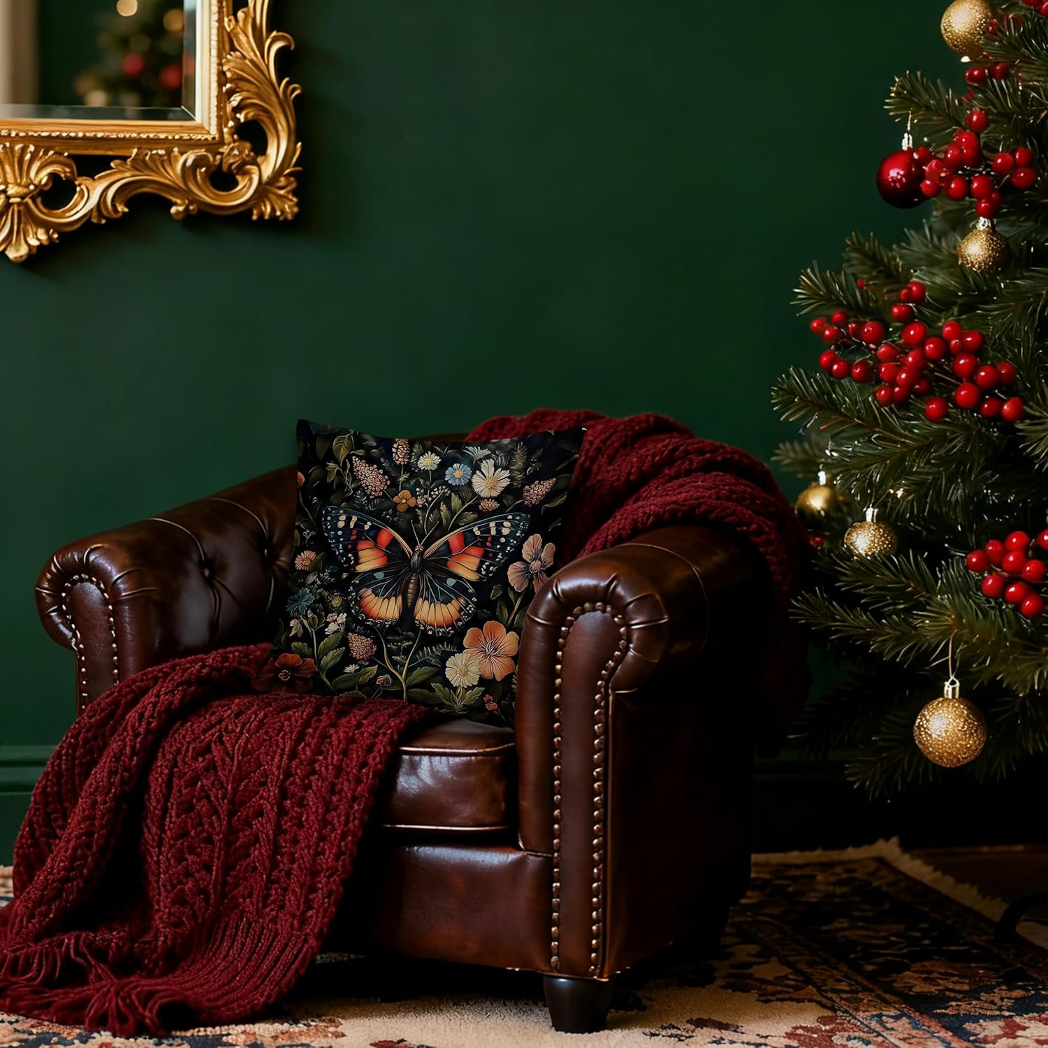 Gorgeous Butterfly Floral Pillow Covers 18x18, Dark Cottagecore Wildflower Botanical Moth Decorative Throw Pillow Covers for Bedroom Living Room Home, Butterfly Room Decor