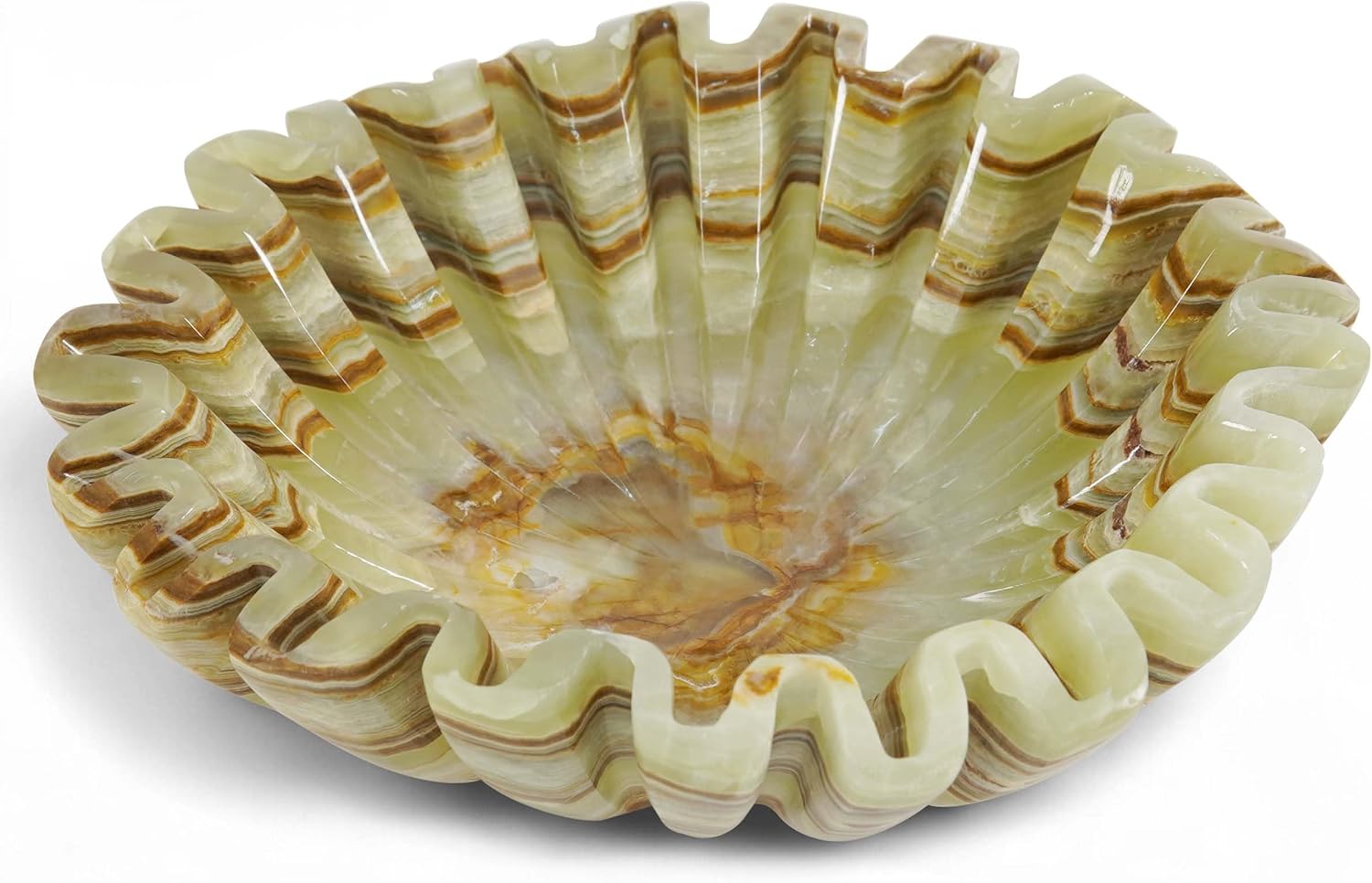 Marble Ruffle Bowl 8 Inch Green Stone Large Decorative Fruit Bowl for Kitchen Counter & Dining Table Centerpiece - Modern Fluted and Scalloped Bowls for Coffee Tables & Home Decor