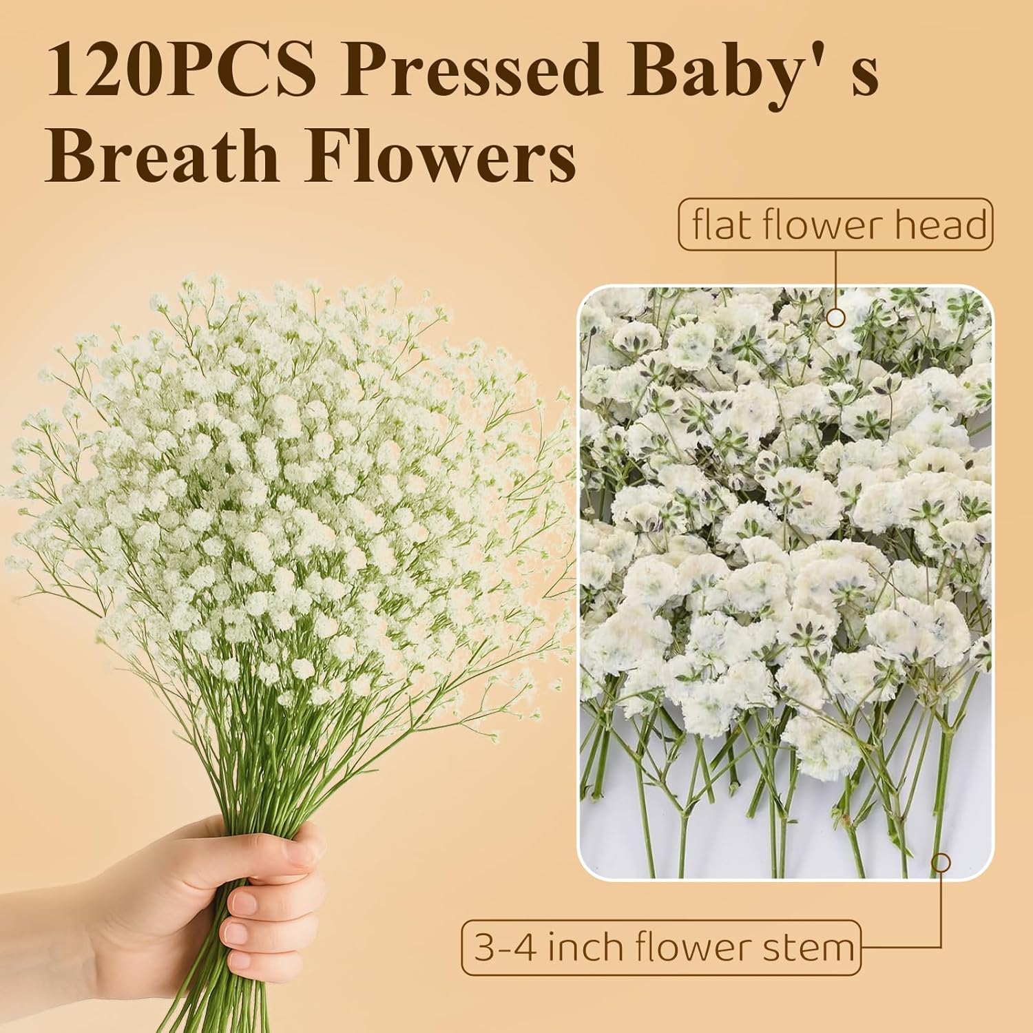Dried Baby' s Breath Flowers Bulk - 120Pcs Pressed Babys Breath for Invitations, Resin Art & DIY Crafts, Natural White Baby Breath with Green Stem for Wedding Cards, Nail Art, Scrapbook