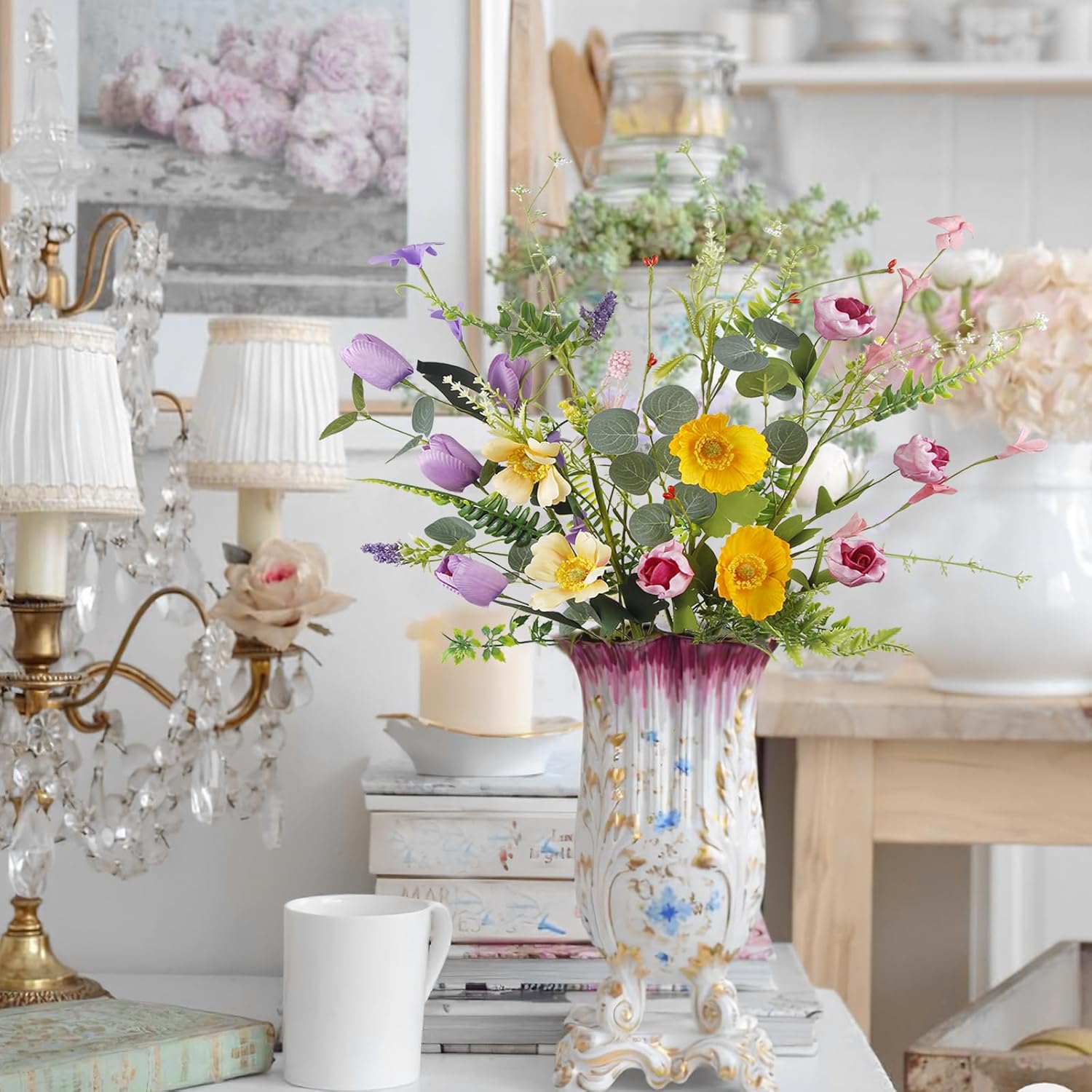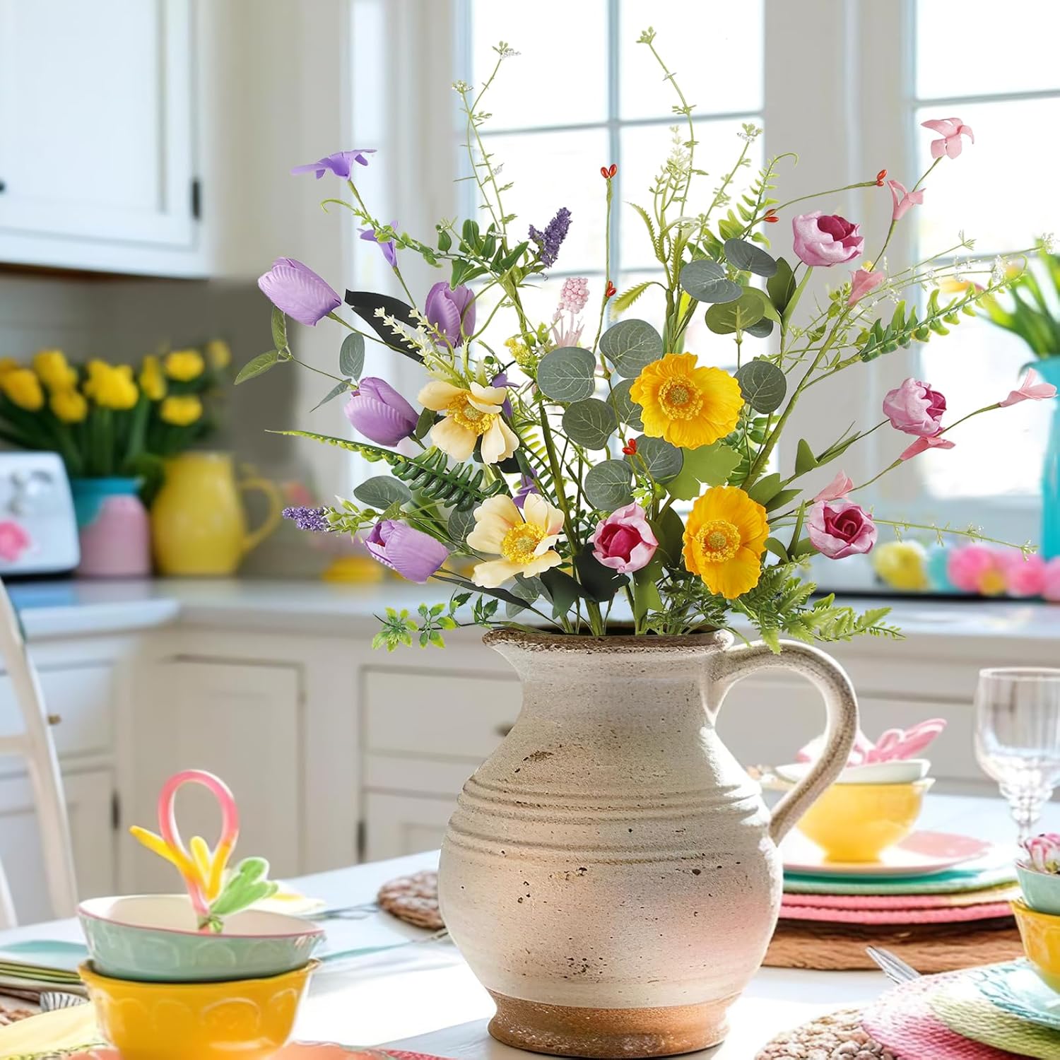 - Spring and summer are a great time to bloom colorful colors. Silk flower arrangements mixes elegant purple, pink and bright yellow, suitable for any occasion that needs bright flowers, also suitable for summer table decoration and Easter table centerpiece, its beautiful and classic look is enough to impress everyone present.