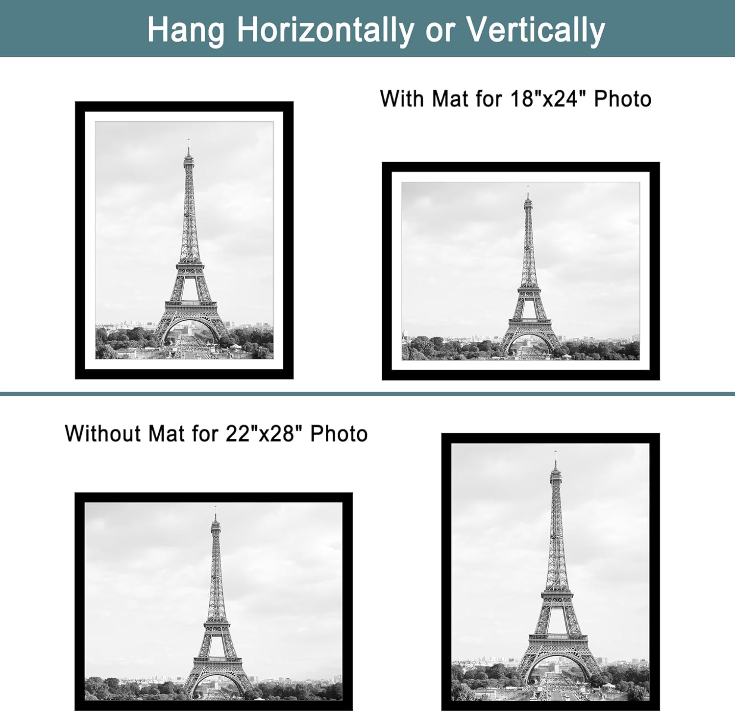 - Double Frames Set: Includes 2 frames in the same size. Perfectly fits 18x24 inch pictures with mat or 22x28 inch without mat. The frame opening display size is 0.5 inches smaller than the photo size for secure mounting.