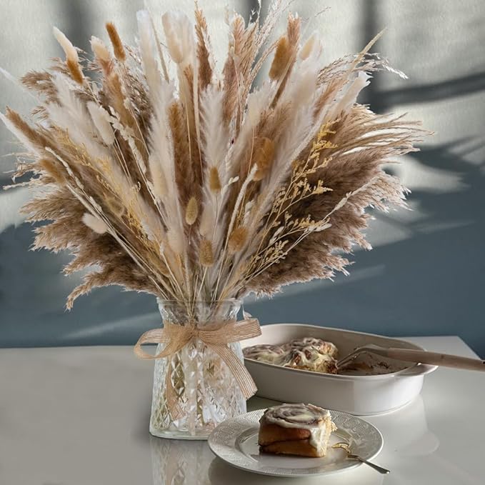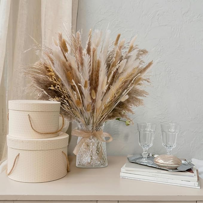 - Natural Dried Flowers in Glass Vase: Pampas grass fits effortlessly with boho, farmhouse, wedding, and modern style decorations, bring elegance and charm atmosphere!
