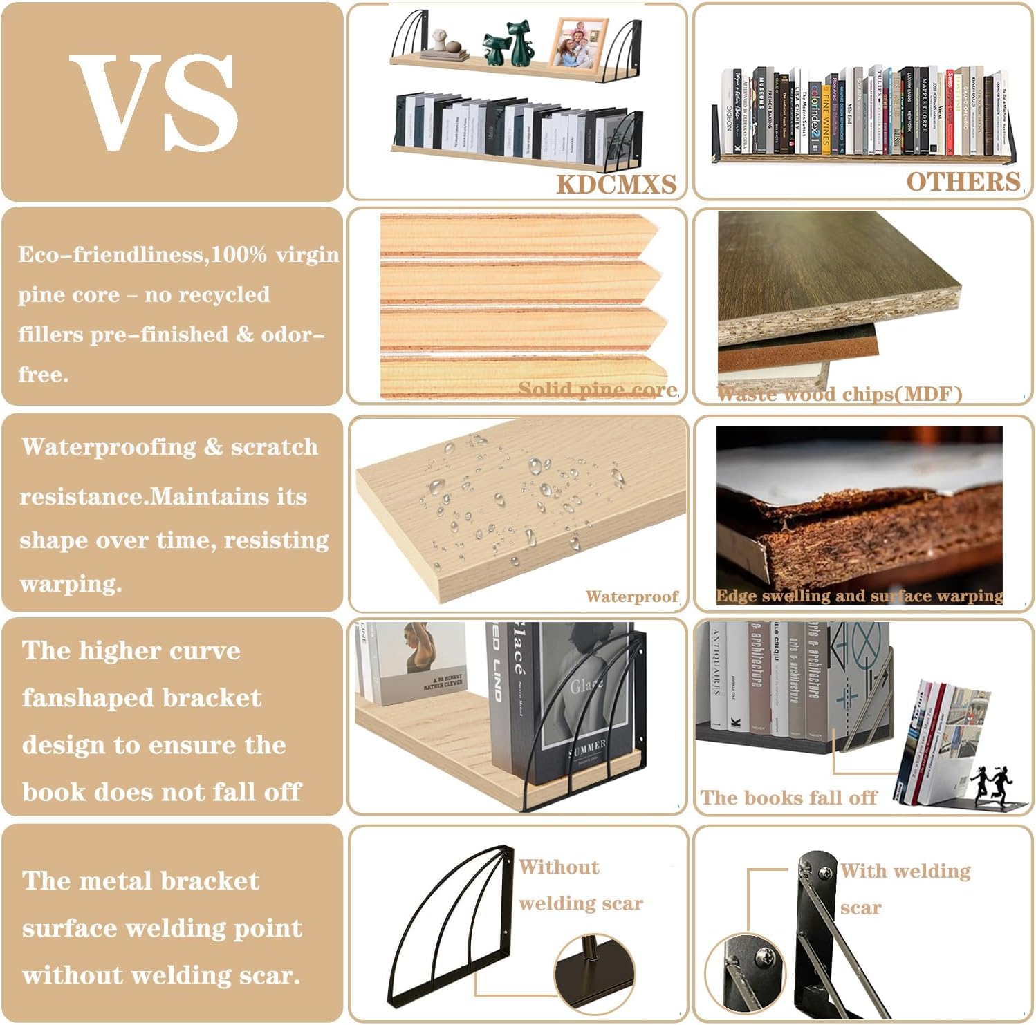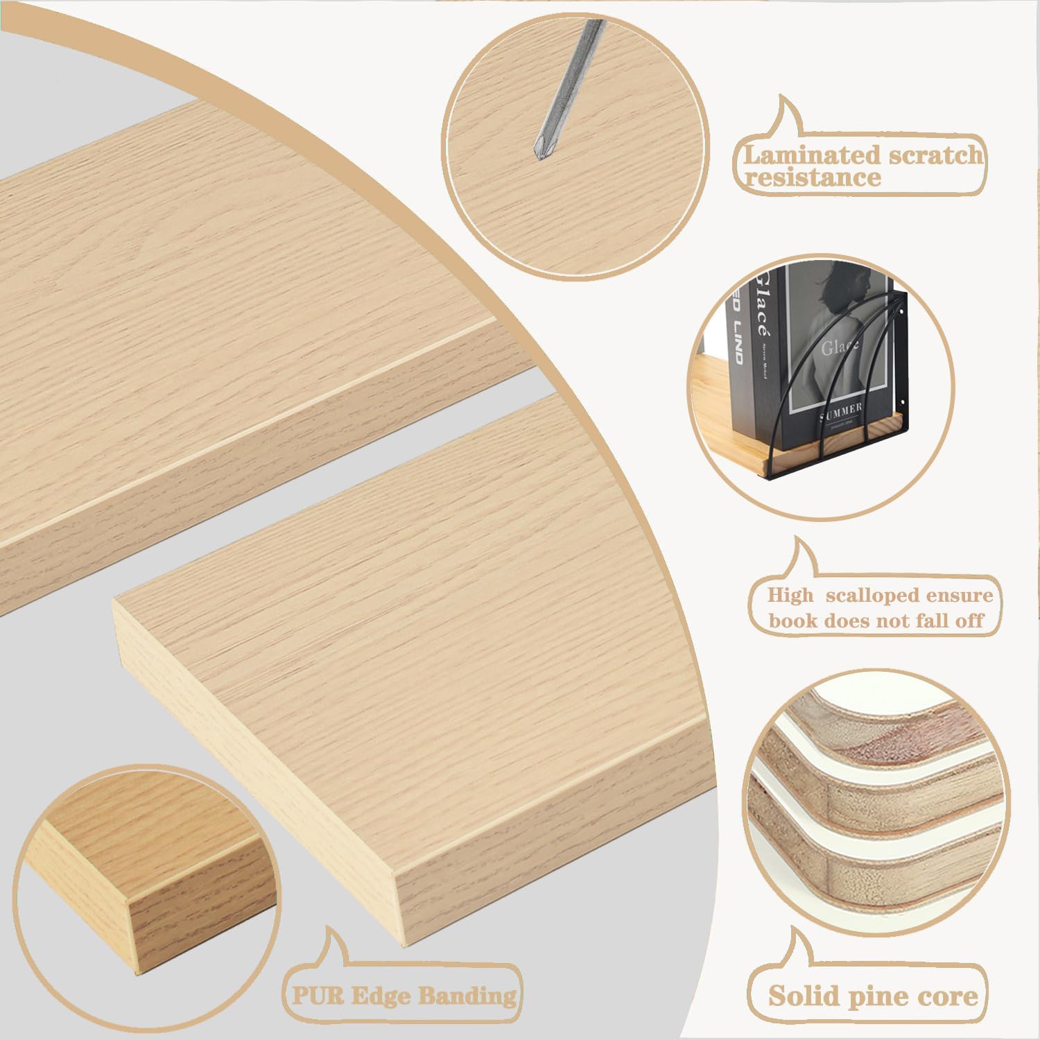 - 【Truly Non-Toxic & Ready-to-Install】100% virgin pine core – no recycled fillers of wood floating shelves,pre-finished & odor-free (VOC-free certified), ideal for closets/wardrobes ,avoid competitors' sawdust-based MDF that swells when damp for white oak gold wall shelf.