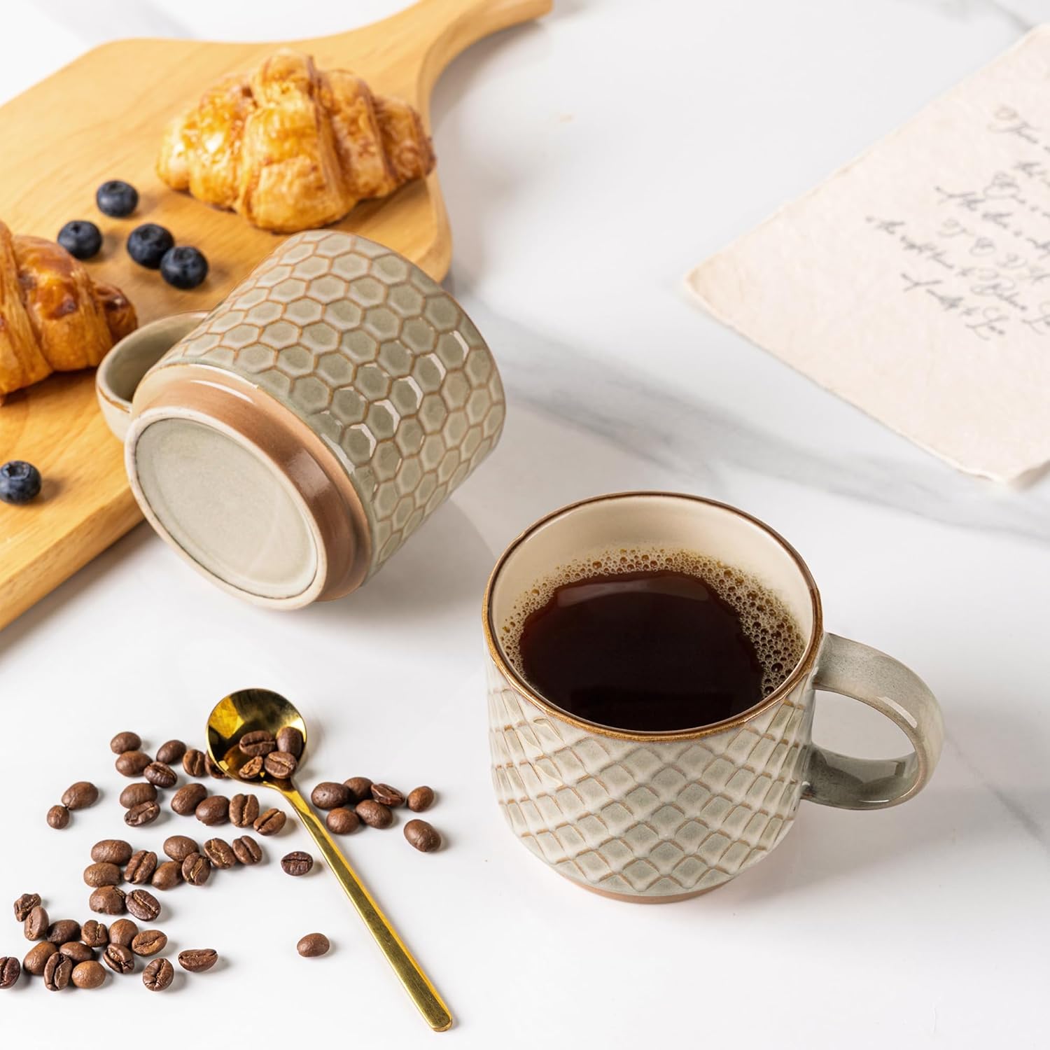 - Stackable and Modern Design: These ceramic mugs feature a beautiful embossed texture design, the smooth rim ensures a comfortable drinking experience, the stackable design allows for easy storage and helps save space in your kitchen.