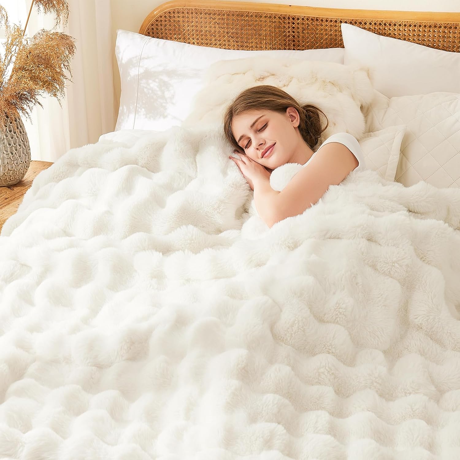 - Ultra Soft & Furry: Our Rabbit Fur Thick Blanket is soft to the touch and perfect for snuggling up on the couch or bed in cold weather, making you feel like you're on a cloud. The bubble faux rabbit fur blanket is made of 650GSM premium microfiber polyester, which is extra soft, fuzzy, and fluffy, making it the perfect companion to keep you warm during the fall and winter months