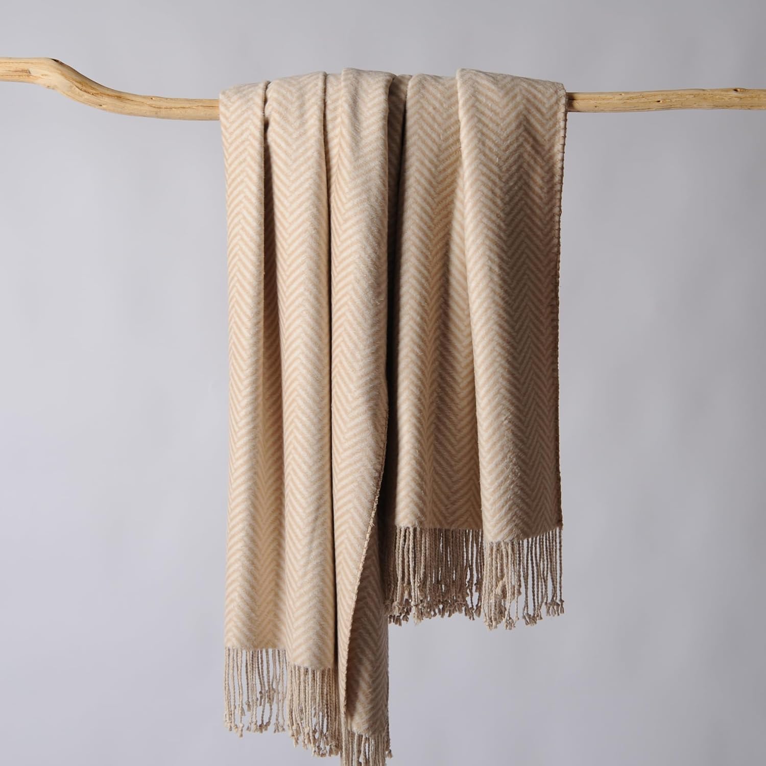 CUDDLE DREAMS Silk Throw Blanket with Hand-Knotted Fringe, Natural, Soft & Breathable (Herringbone-Taupe)