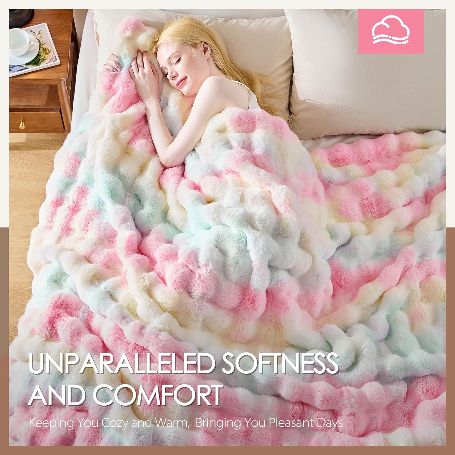 • LUXURIOUS COZY FAUX RABBIT FUR FABRIC: This bubble blanket is crafted from 780GSM plush faux rabbit fur fabric for warmth and comfort, and 220GSM crystal velvet fabric lining for silky softness. The furry faux rabbit fur throw blanekt feel as soft as clouds and gently wrap you like a warm embrace, giving you a comfortable double-sided experience, making you feel cozy all winter long.