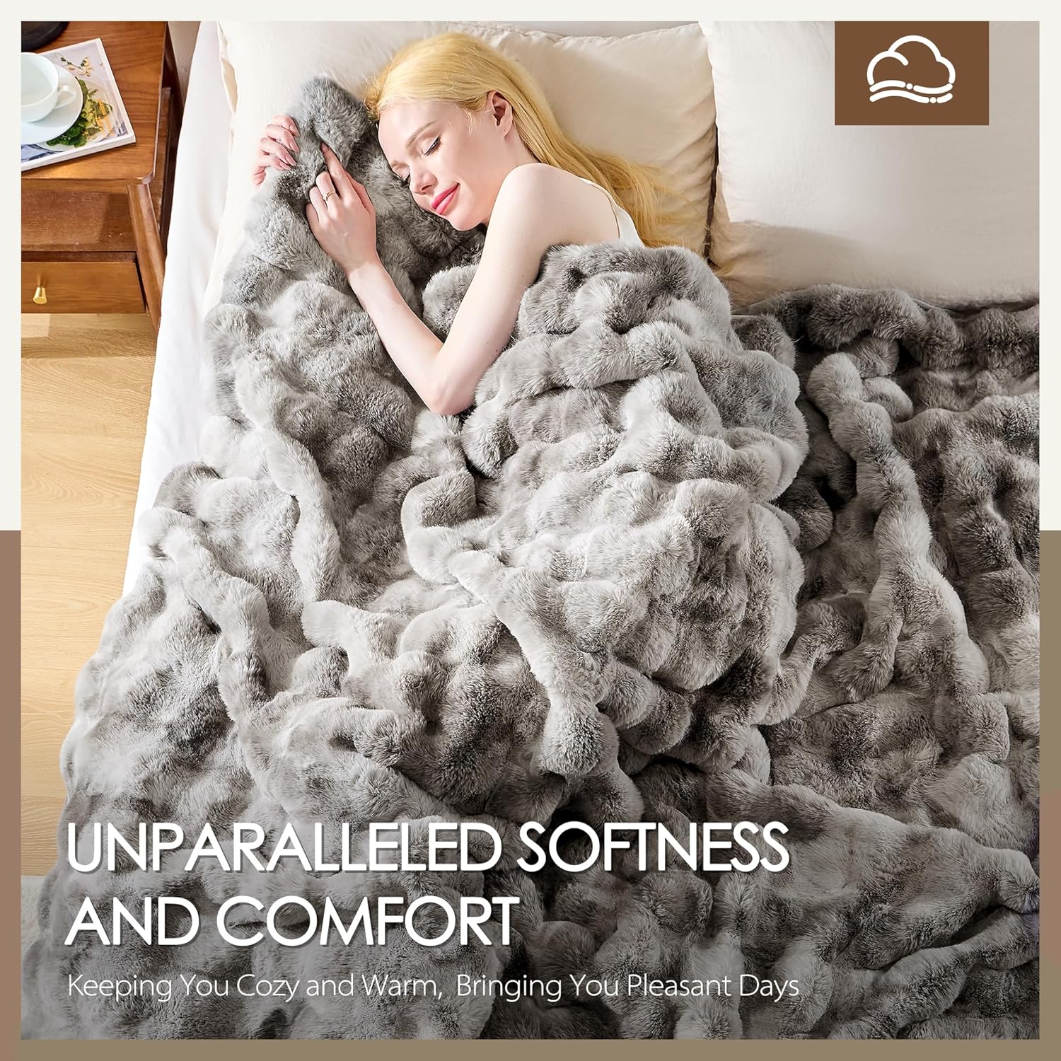 • LUXURIOUS COZY FAUX RABBIT FUR FABRIC: This bubble blanket is crafted from 780GSM plush faux rabbit fur fabric for warmth and comfort, and 220GSM crystal velvet fabric lining for silky softness. The furry faux rabbit fur throw blanekt feel as soft as clouds and gently wrap you like a warm embrace, giving you a comfortable double-sided experience, making you feel cozy all winter long.