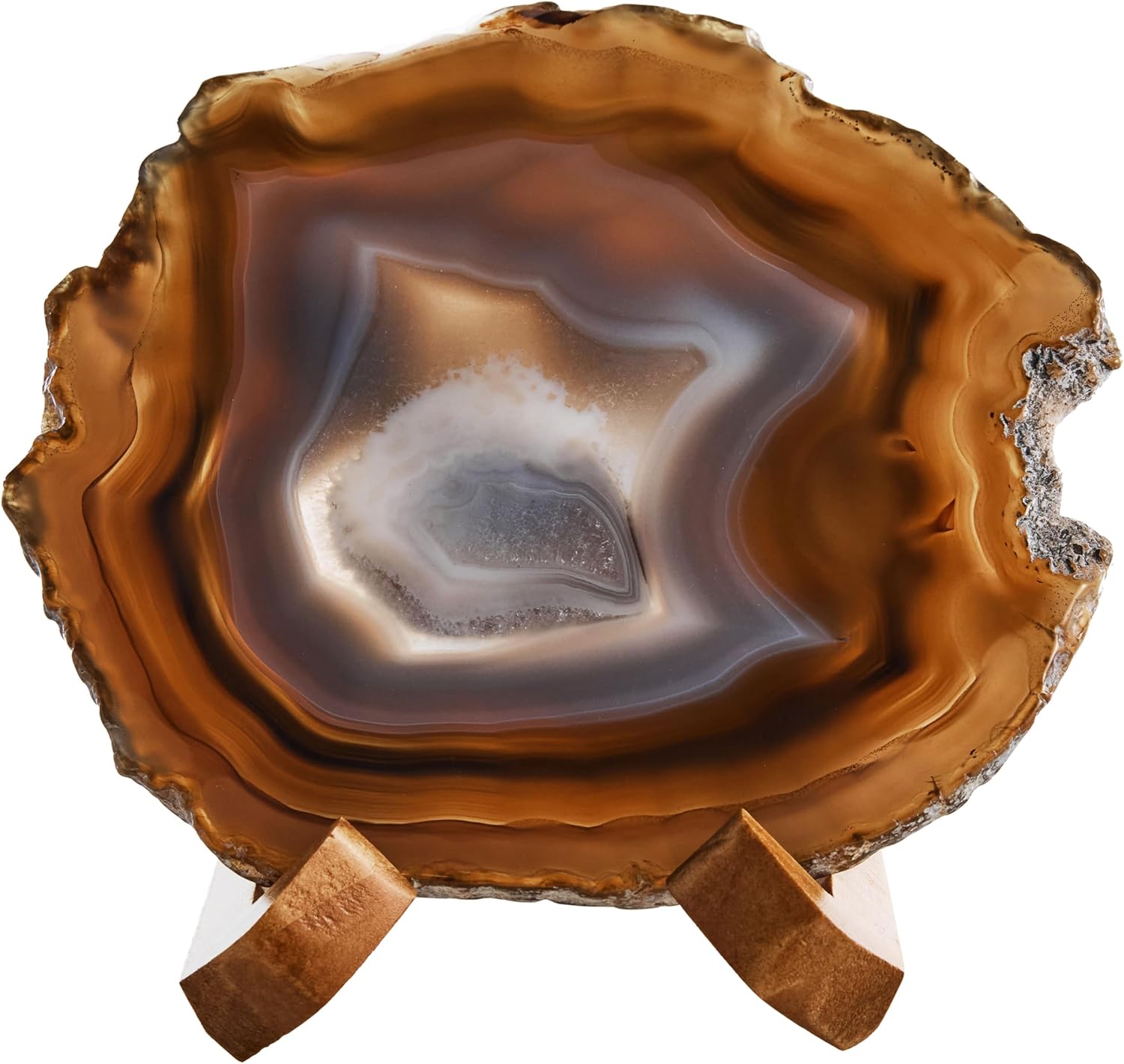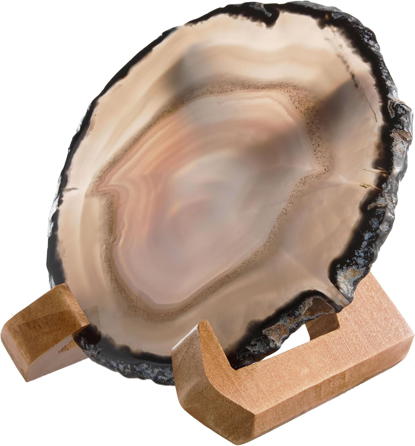 Luxury Lane Large Natural Brazilian Agate Slice Geode Rock Stone Drink Coaster with Wood Holder 4.7-5.5 inch Centerpiece Table Decoration, Ash Gray