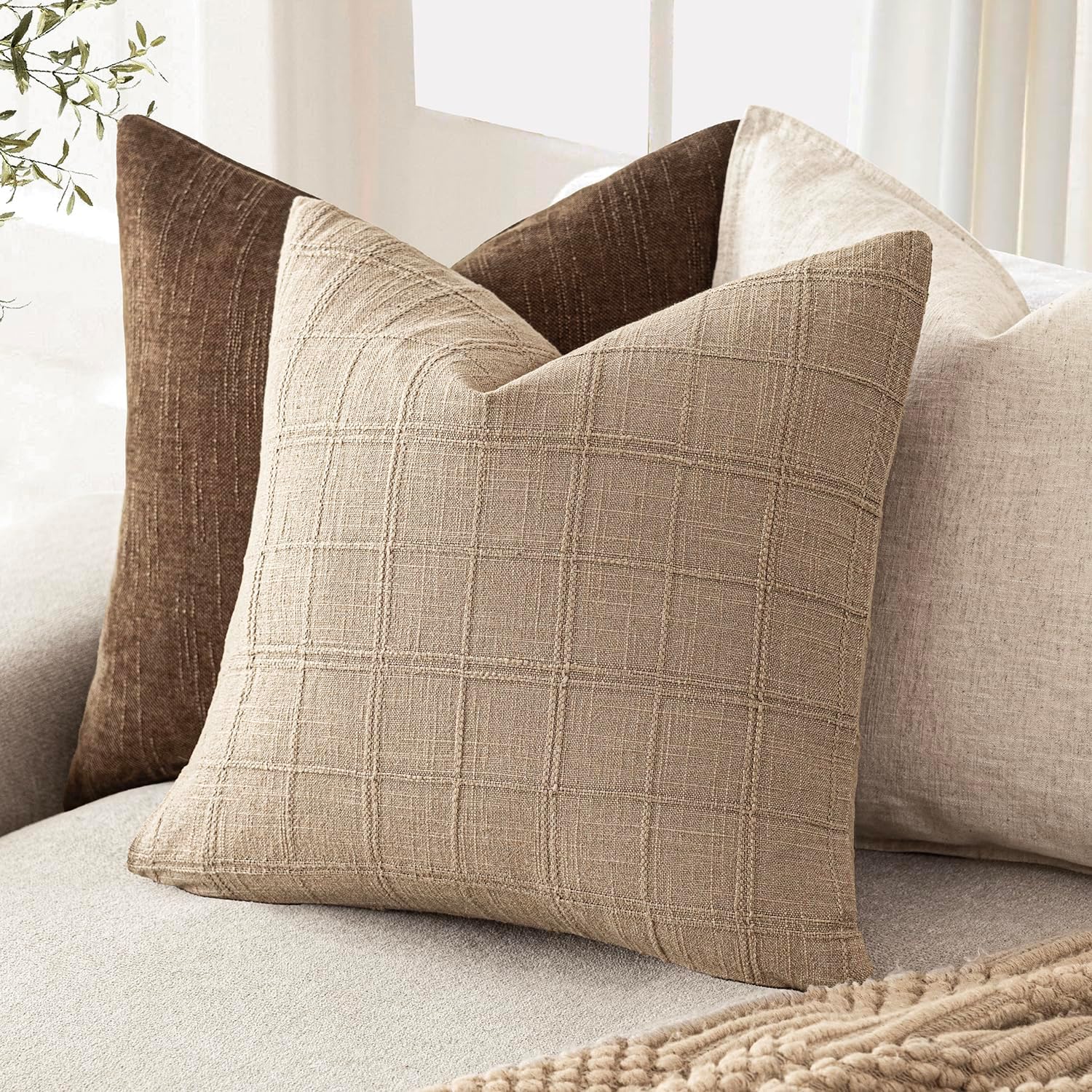 Foindtower Set of 2 Decorative Linen Check Throw Pillow Covers Neutral Farmhouse Vintage Cushion Covers Modern Coastal Boho Home Decor for Sofa Chair Couch Bedroom Living Room,16×16 Inch,Camel