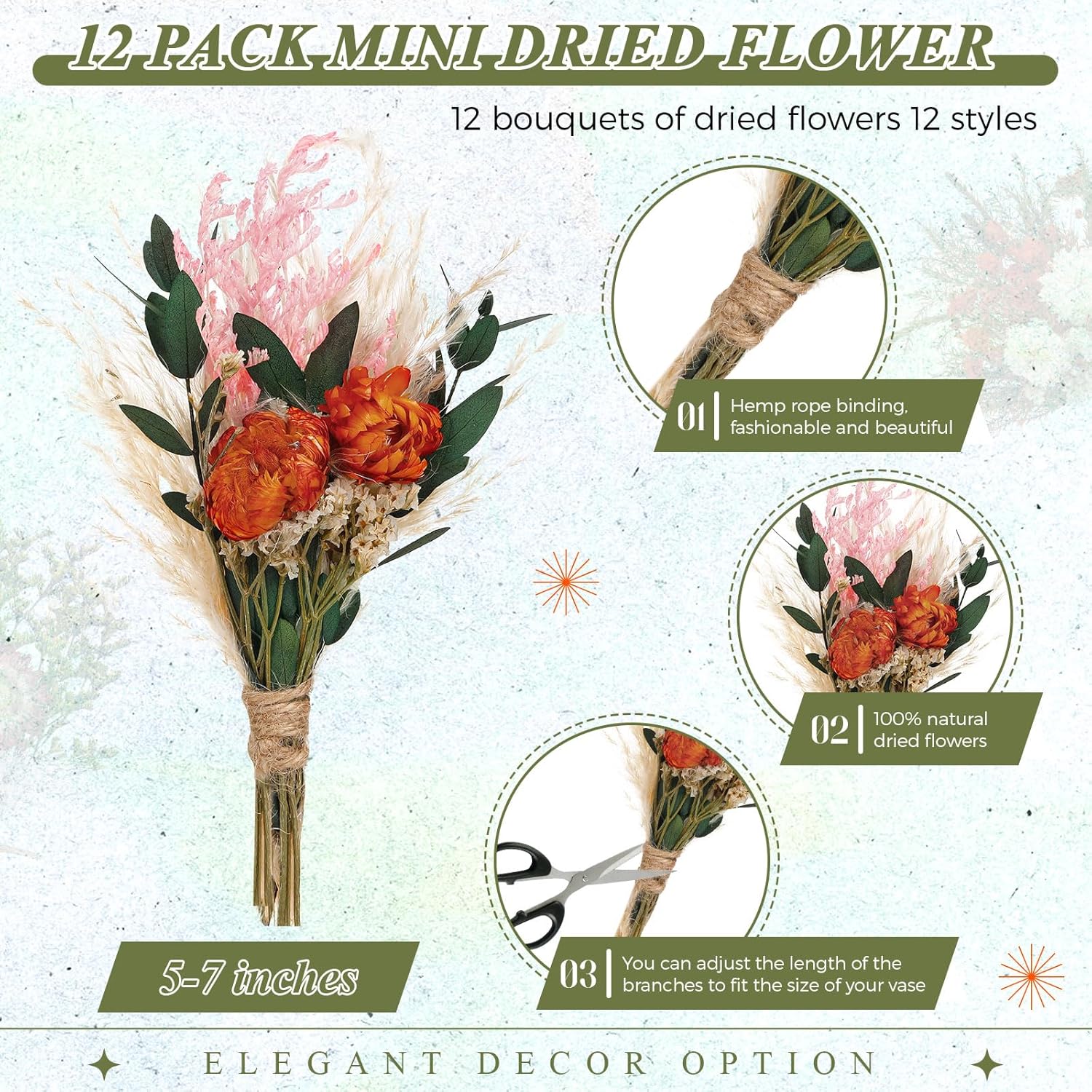 - Abundant and Versatile Collection: you will receive 12 dried bouquets which are beautiful and energetic in various colors and styles; This abundant quantity ensures that there are plenty for your daily use, replacements, and varied decorative applications; This collection suits different people's tastes, making your Bohemian wedding or home decoration project more lively and refreshing