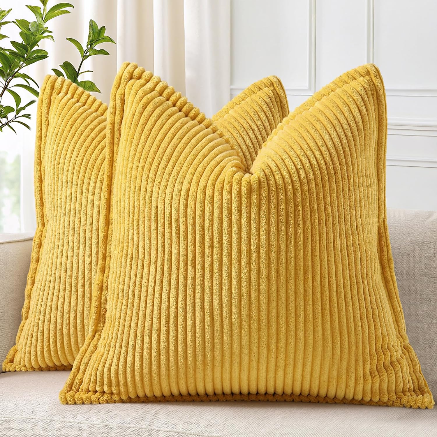 decorUhome Corduroy Mustard Yellow Throw Pillow Covers 26x26 Set of 2 Decorative Soft Boho Farmhouse Euro Couch Pillow Covers for Living Room Bed Sofa Broadside Striped Pillow Cases