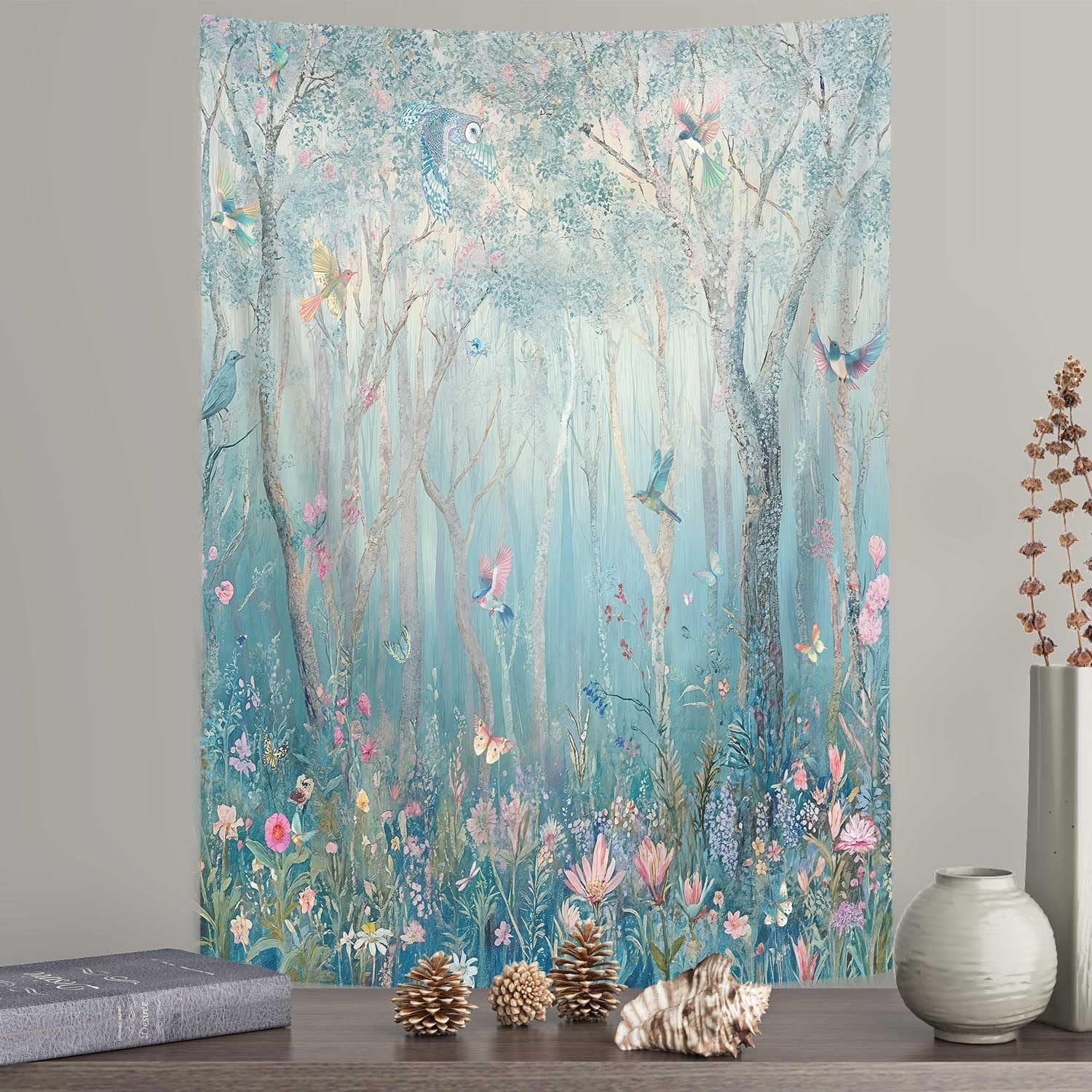 DYNH Enchanted Forest Tapestry,Fairytale Woodland Vertical Wall Hanging,Jungle with Tree Bird Flowers Plant Aesthetic for Bedroom Decor Art Tapestries Poster Blanket,40X60IN
