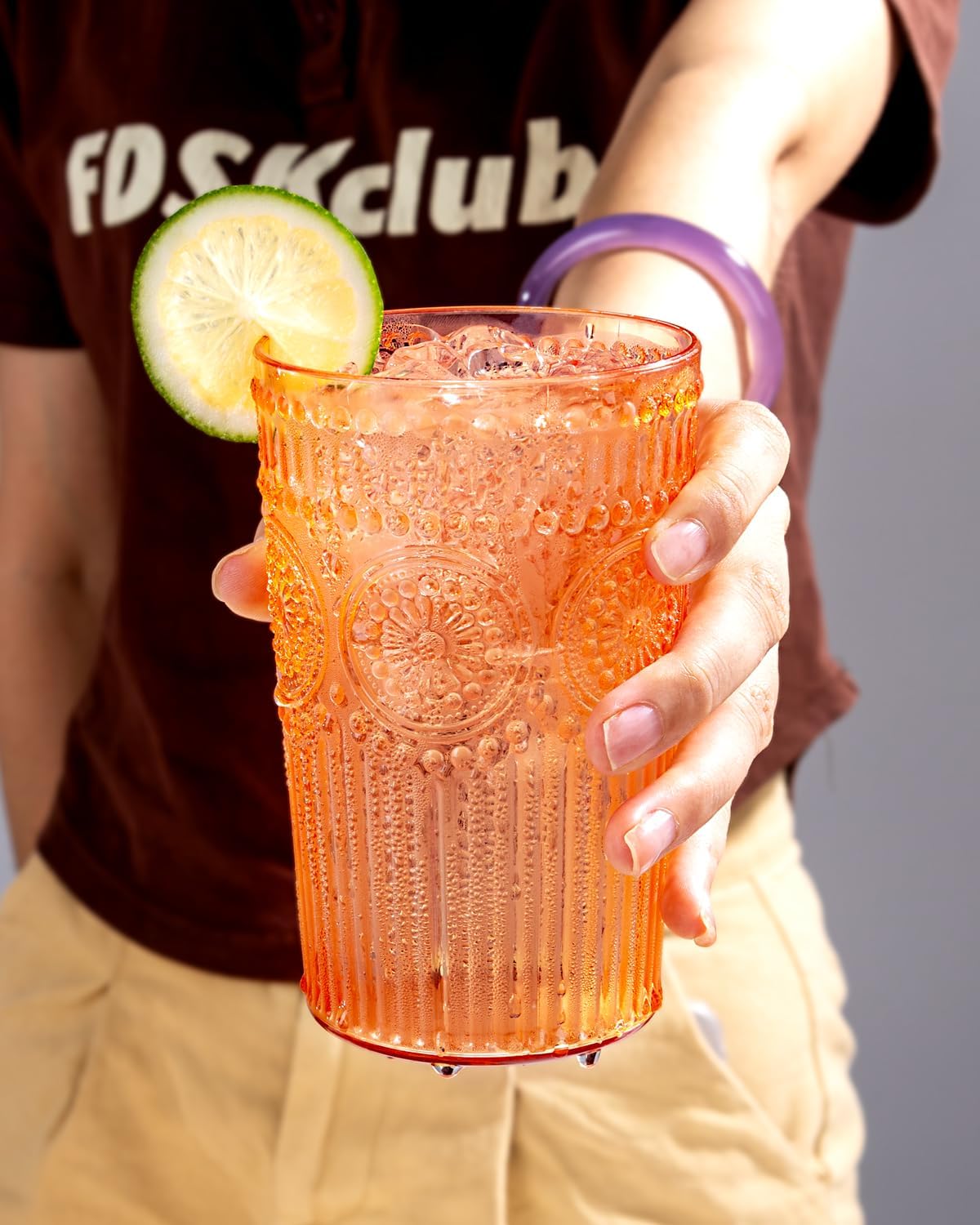 - UNIQUE AND VINTAGE DESIGN: The retro flavor makes this romantic plastic water glasses beautiful and unique. Our vintage plastic drinking glasses are embossed designed with 12 plastic vintage glasses for your favorite juice and cocktail drinks. The plastic drinking glasses have been designed to fit any kind of tableware.