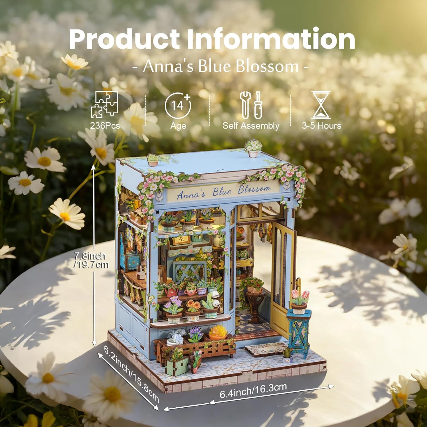 Fsolis Book Nook Kit - DIY Scene Miniature Dollhouse Kit for Adults, Bookshelf 3D Puzzles 255PCS, Tiny House Mini Flower Shop Model Booknook Craft, Gifts for Women Puzzle Lovers (Anna's Blue Blossom)