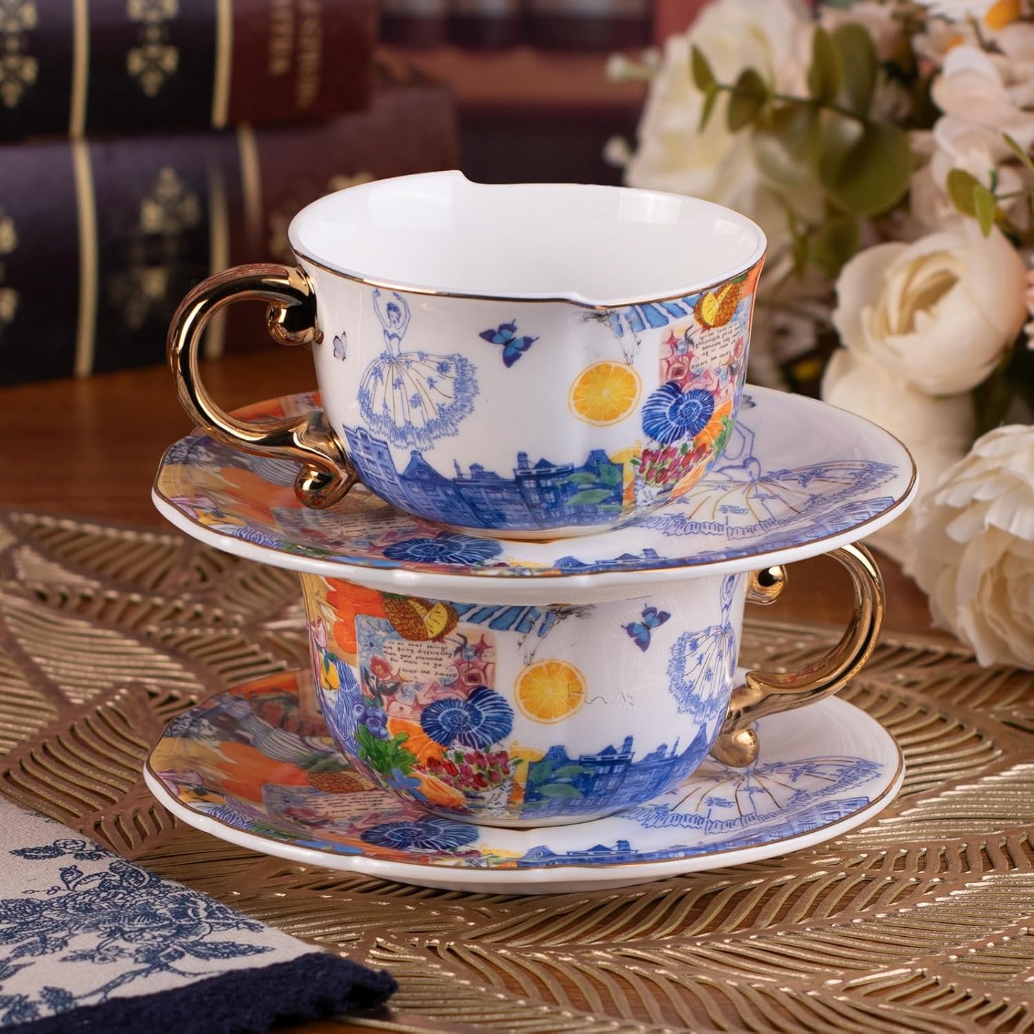 KAMMAK Tea Cups and Saucers Set of 2, Fine Bone China Coffee Cups, 8.5-Ounce Stackable Espresso Mugs, Ceramic Demitasse for Coffee, Cappuccino, Latte, Americano, Tea, Dream Ballet