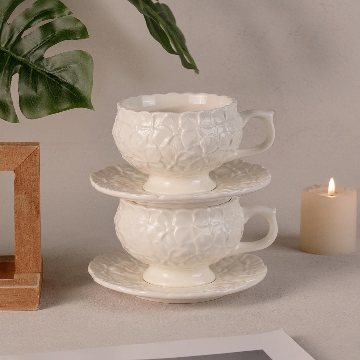 KAMMAK Tea Cups and Saucers Set of 2, Porcelain Coffee Cups, 8.5-Ounce Stackable Espresso Mugs, Ceramic Demitasse for Coffee, Latte, Americano, Tea, White Flower