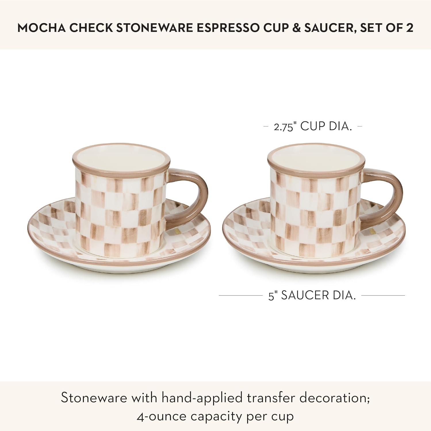 MACKENZIE-CHILDS Set of 2 Stoneware Espresso Cup and Saucer, Cute Coffee Cups, Brown-and-White Mocha Check