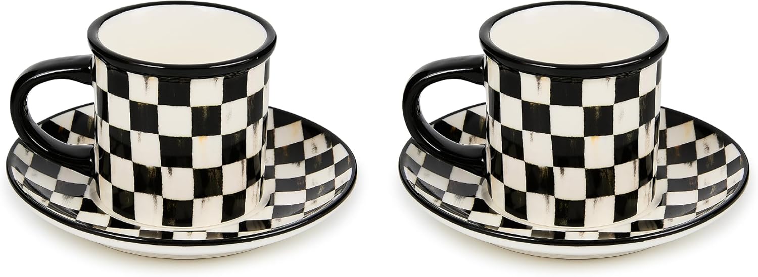 - ELEGANT SERVING SET: Serve delicious drinks in style using our Courtly Check stoneware espresso cups and saucers. These black-and-white checkered coffee accessories are the perfect way to enjoy your daily caffeine fix.