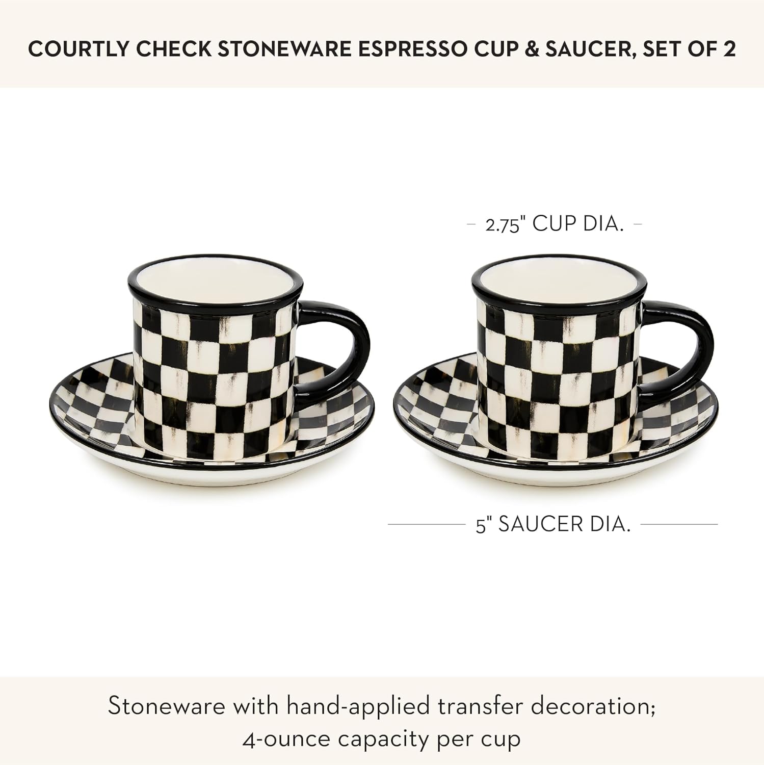 MACKENZIE-CHILDS Set of 2 Stoneware Espresso Cup and Saucer, Cute Coffee Cups, Black-and-White Courtly Check