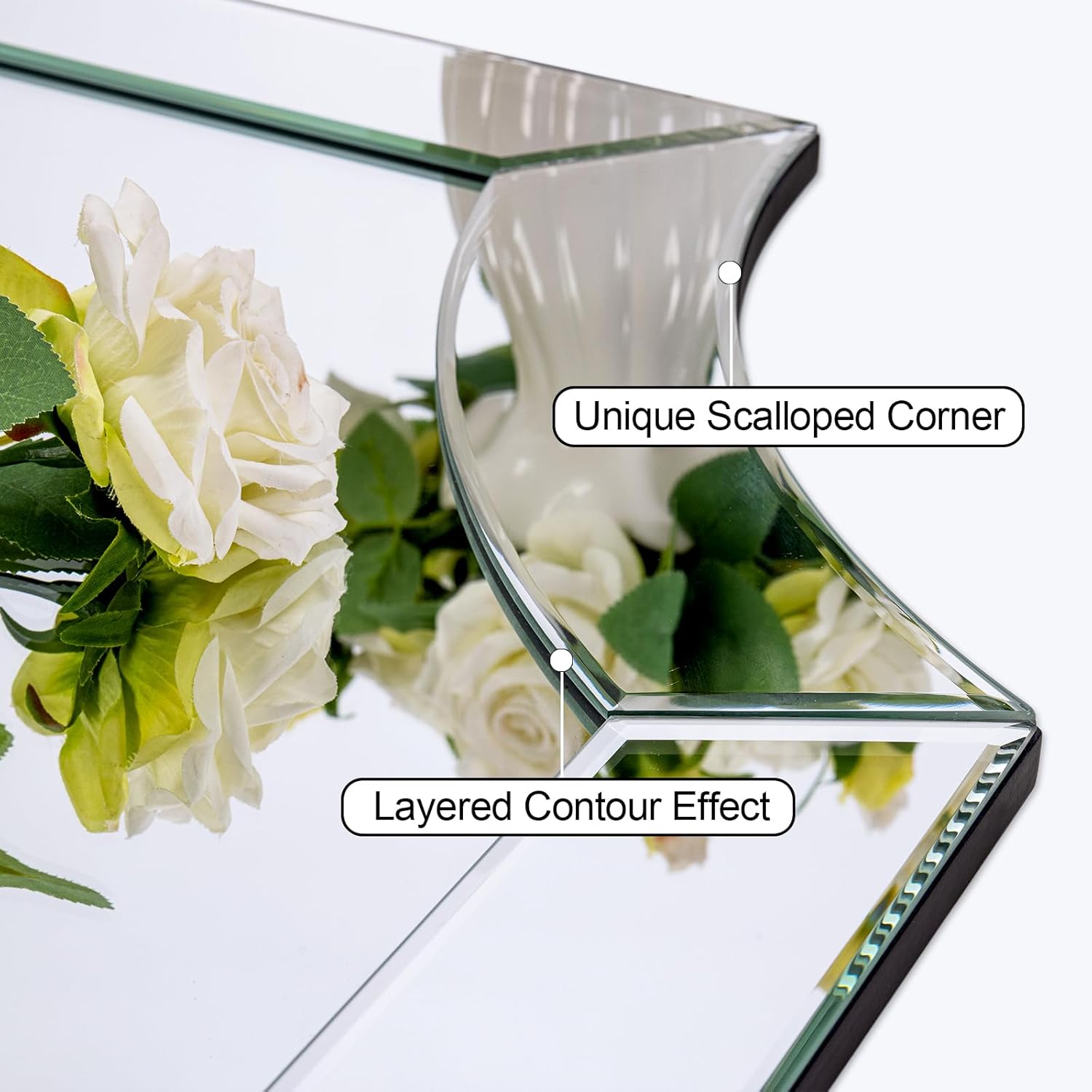 - Sophisticated Design: The upper mirror frame features an elegant scalloped corner shape. It's a tradition wall mirror style, but it also gives the mirror a simple and modern look. Perfect for consoles, mantels, or as decorative mirrors for wall placement in bathrooms, living rooms, dining rooms, or vanities