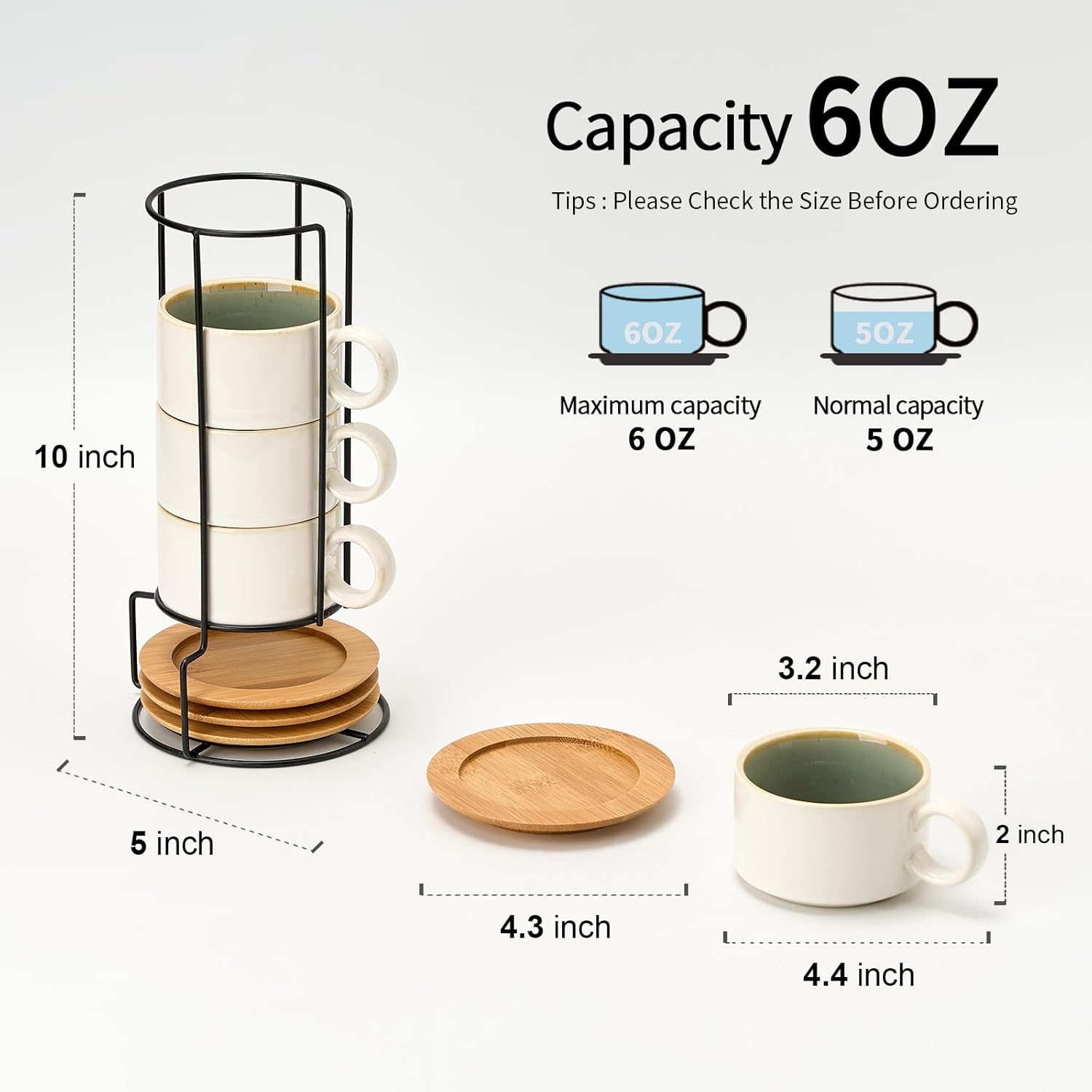 LUKA 6 Ounce Porcelain Stackable Espresso Cups with Saucers and Metal Stand Set of 4, Ceramic Cappuccino Cups Set for Specialty Coffee Drinks, Latte, Cafe Mocha and Tea, White Green Interior