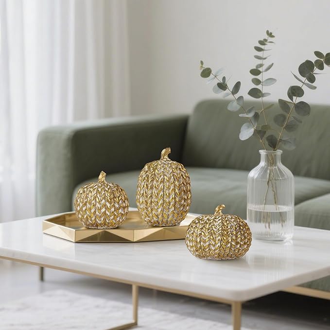 - Premium Resin Pumpkin Decor with Gold Finish: Crafted from non-toxic, high-quality resin, these lifelike fall decorations for home feature hand-applied gold accents and textured weaving. Their weighty feel and premium material make them suitable for indoor fall home decor, coffee table decor, and farmhouse decor.