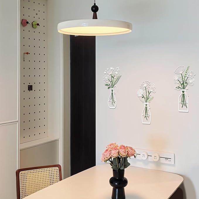 3 Pieces Metal Flower Wall Art - Wordless Minimalist Floral Silhouettes in Vases, Black Rustic Farmhouse Decor for Living Room, Bedroom, Bathroom, Dining Room, Housewarming Gift(Pink -White)
