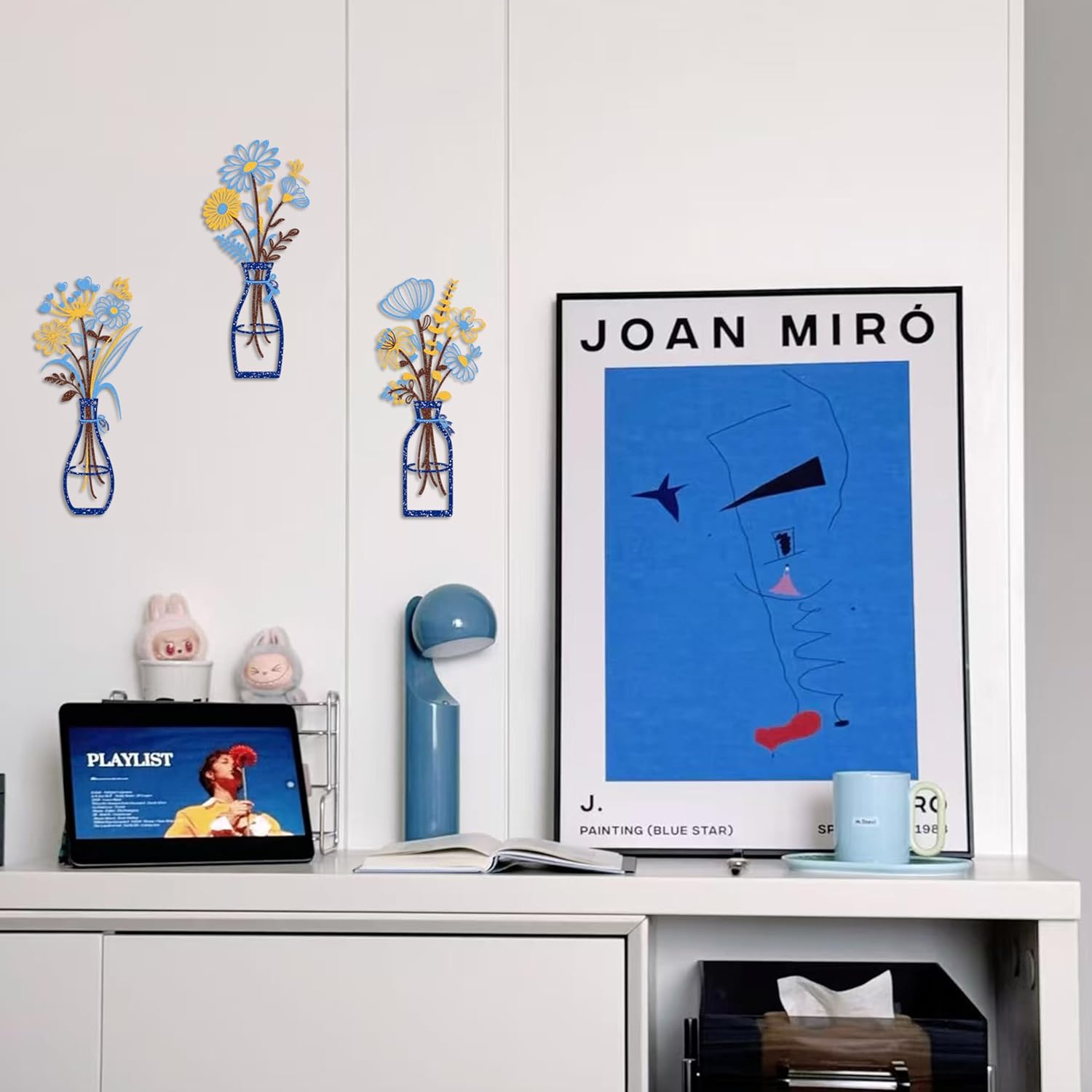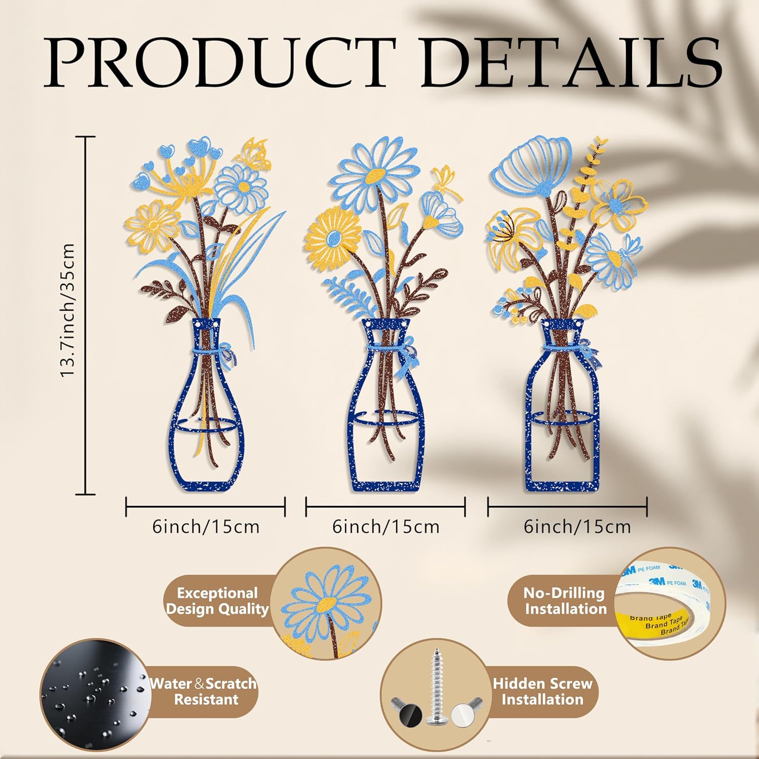 Iron Metal Vase Flower Wall Art Set of 3 - Minimalist Black Floral Decor for Living Room Bedroom Kitchen, Office Garden - Modern Farmhouse Home Decor & Housewarming Gifts (Blue-Yellow)