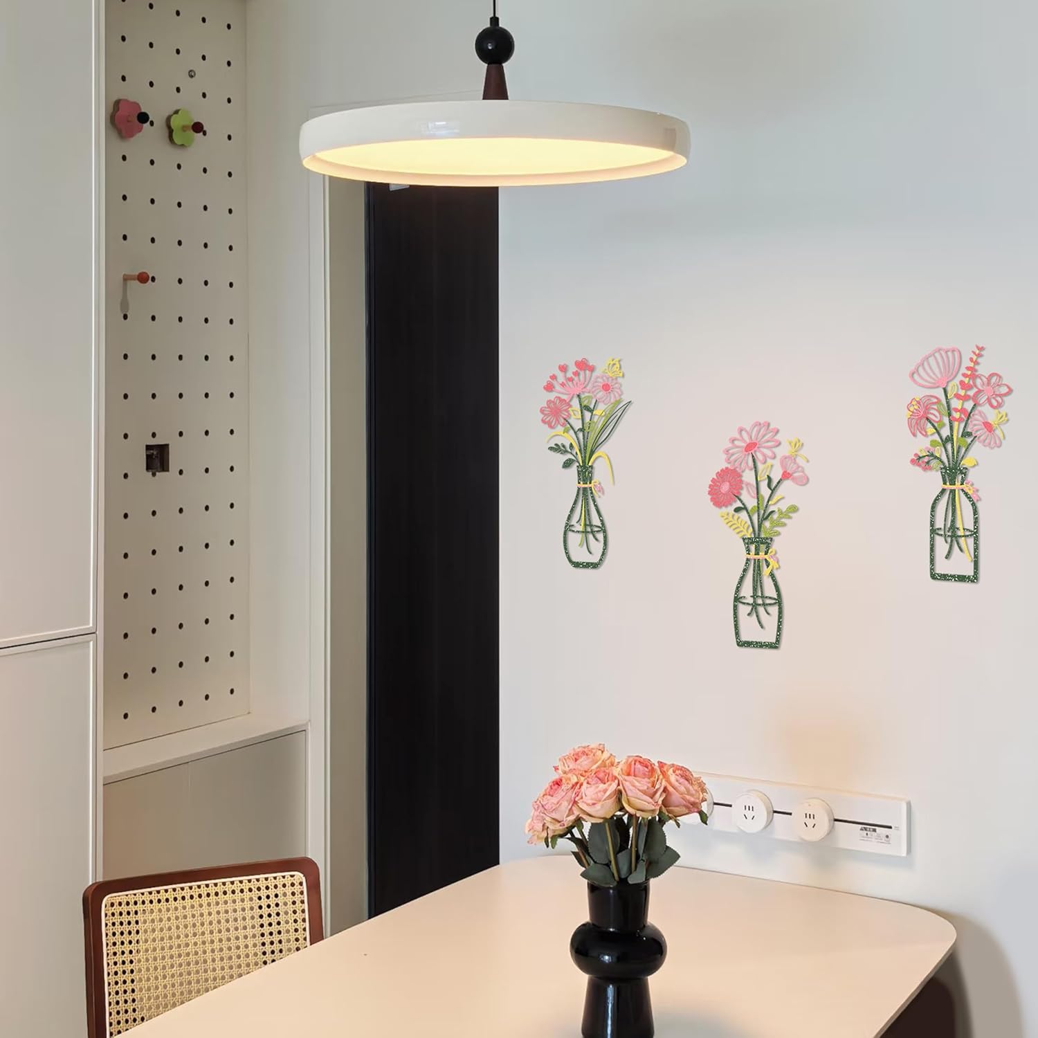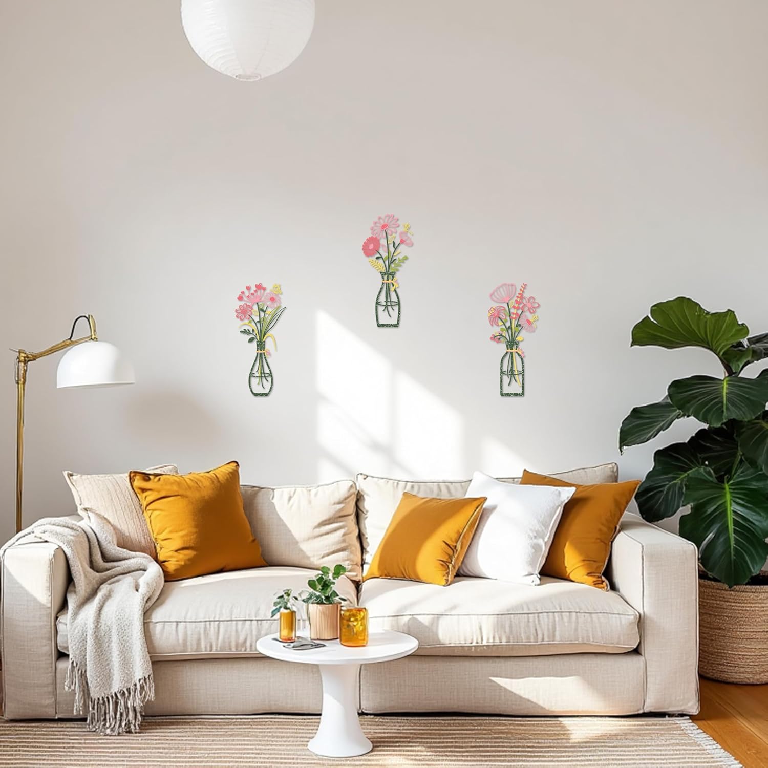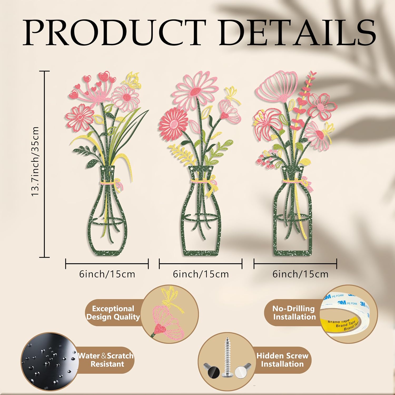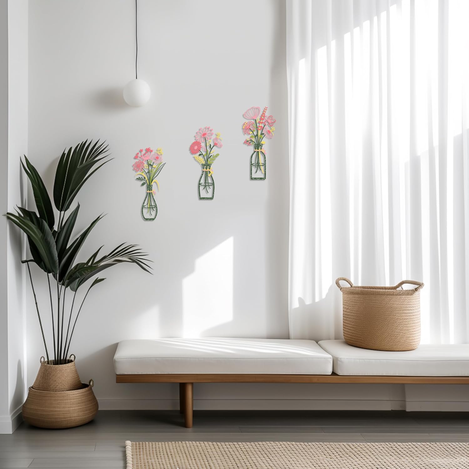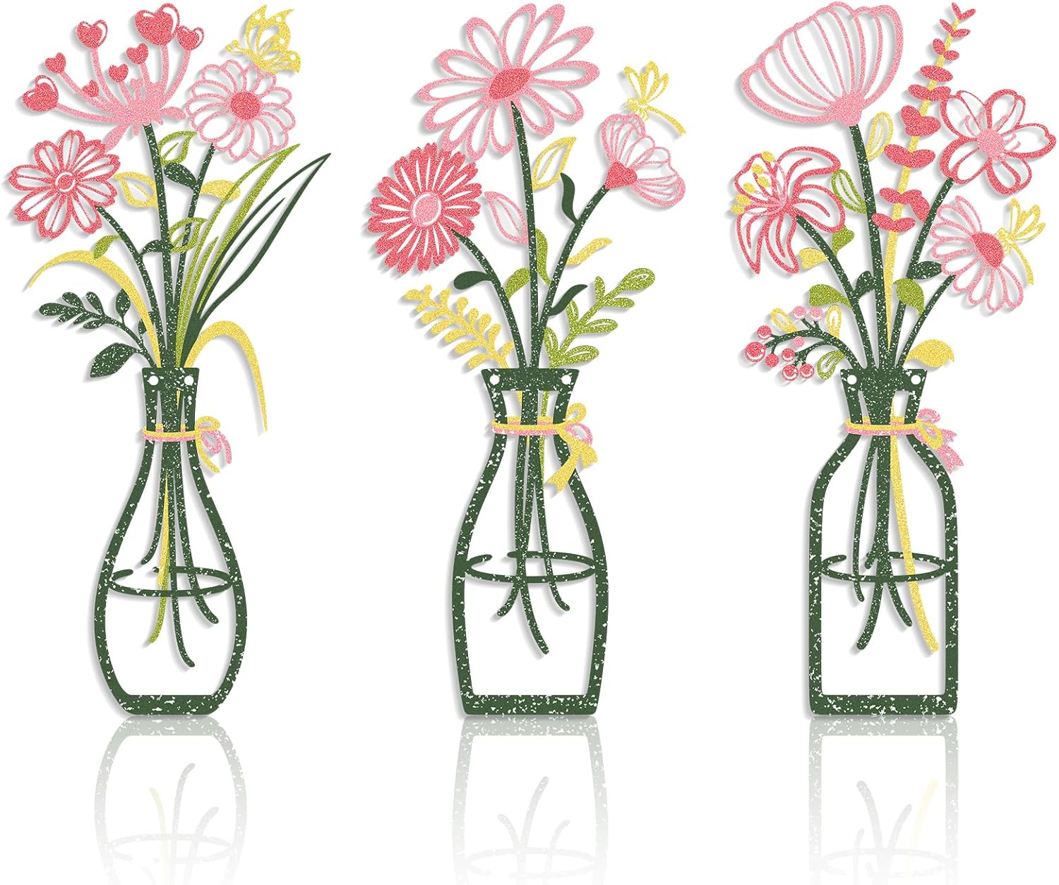 Iron Metal Vase Flower Wall Art Set of 3 - Minimalist Black Floral Decor for Living Room Bedroom Kitchen, Office Garden - Modern Farmhouse Home Decor & Housewarming Gifts (Green-Pink)