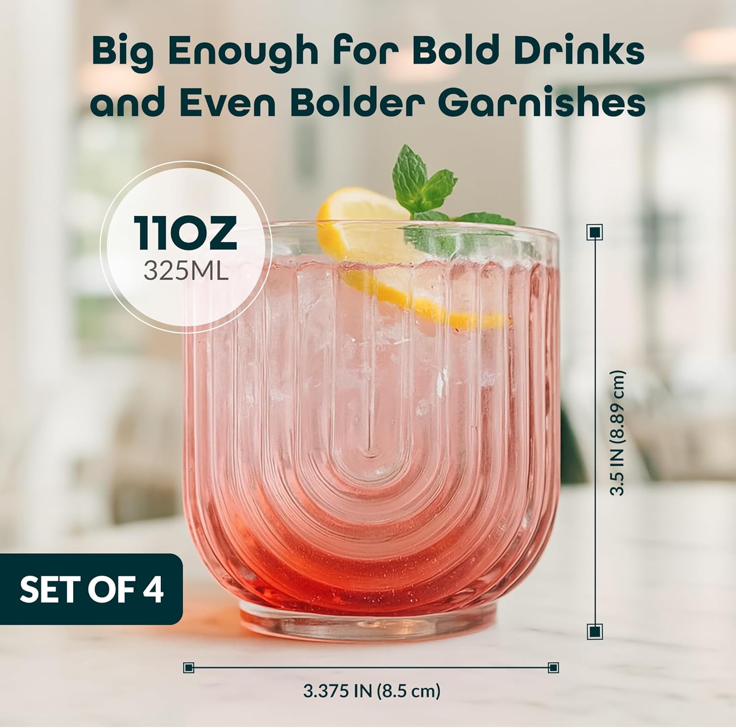 Glaver's Vintage Glassware Art Deco Glasse Ribbed Drinking Glasses U-Shape Arch Design Colored Cocktail Kitchen Tumblers Everyday Dinner Decorative Party (Pink S/4 11oz)