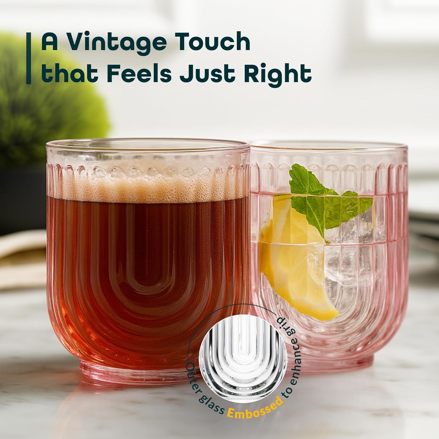 - 💖ELEGANT DESIGN: Art Deco U-shaped pattern in pink glass creates a stunning vintage-inspired look perfect for any home bar or dining setting. These blush pink double old-fashioned whiskey glasses are perfect for a variety of alcoholic beverages, including spirits neat or on the rocks, cocktails, bourbon, scotch, or any other soft cold drink like water and juice.