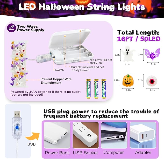 - Wide Application: This Halloween string lights battery powered and with usb,16FT 50 LED can be hung in your windows, doors, hallways, stairs, gardens,trees, fireplace, courtyard, patio, lawn, porch, fence or bedrooms and parties for Halloween decorations indoor and outdoor