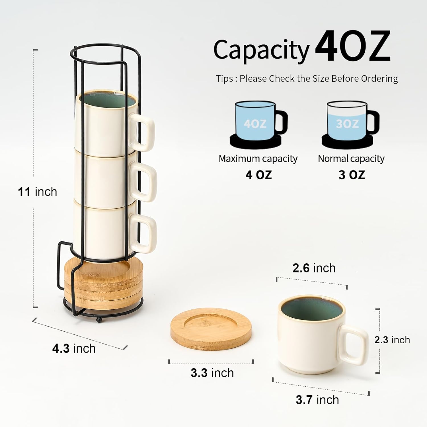 LUKA Porcelain Stackable Espresso Cups with Saucers and Metal Stand, 4 Ounce Small Ceramic Demitasse Cups Set for Latte, Specialty Coffee Drinks, Cafe Mocha,Tea - Set of 4, White Green Interior