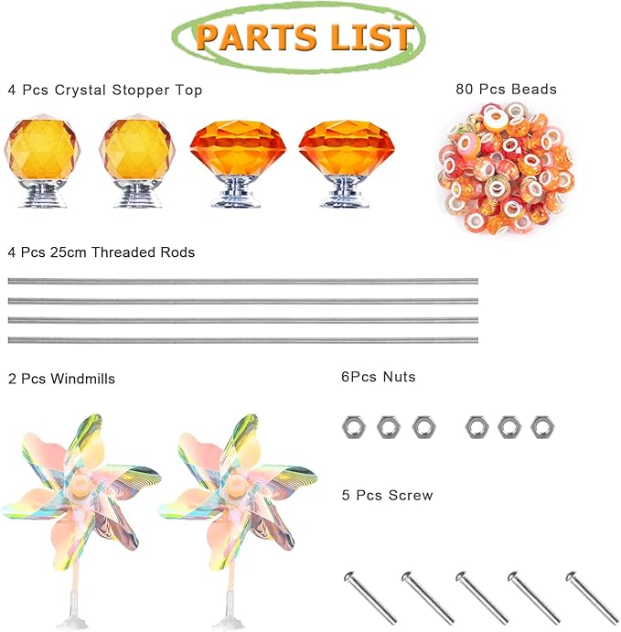 - 【What Will You Get】Beaded Garden Stakes Kit, 4 Pcs 25cm stainless steel threaded rods, with 6 stainless steel nuts, 4 Orange Crystal Stopper Tops, 2 colored small windmills, and 80 Orange random style Garden Stakes large hole beads ; This will add color and fun to your garden stake creation
