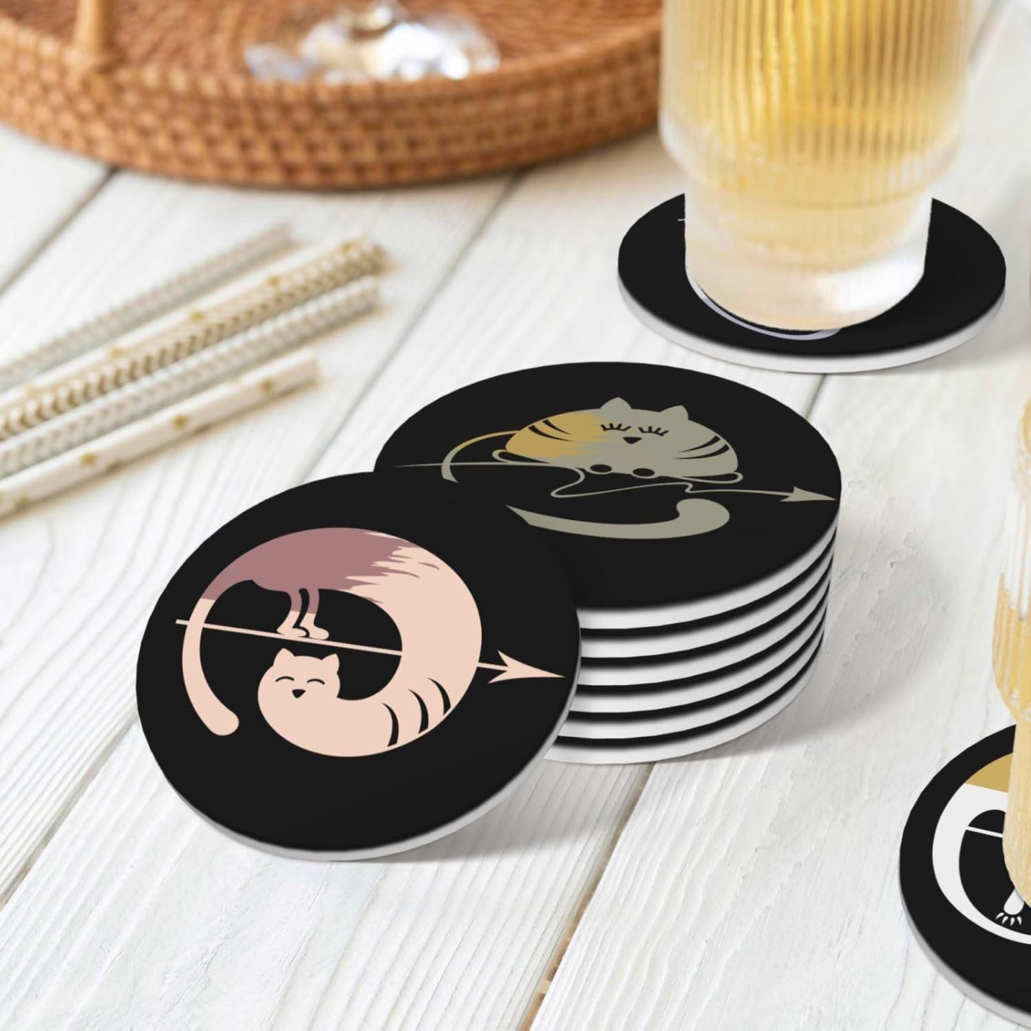 Funny Cat Absorbent Drink Coasters with Holder, Set of 6 Ceramic Coasters with Cork Base for Table Decor