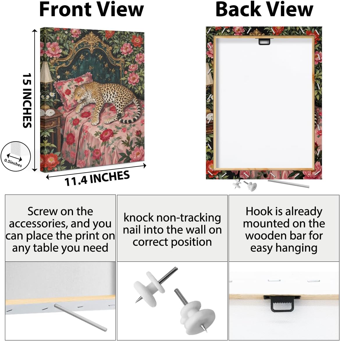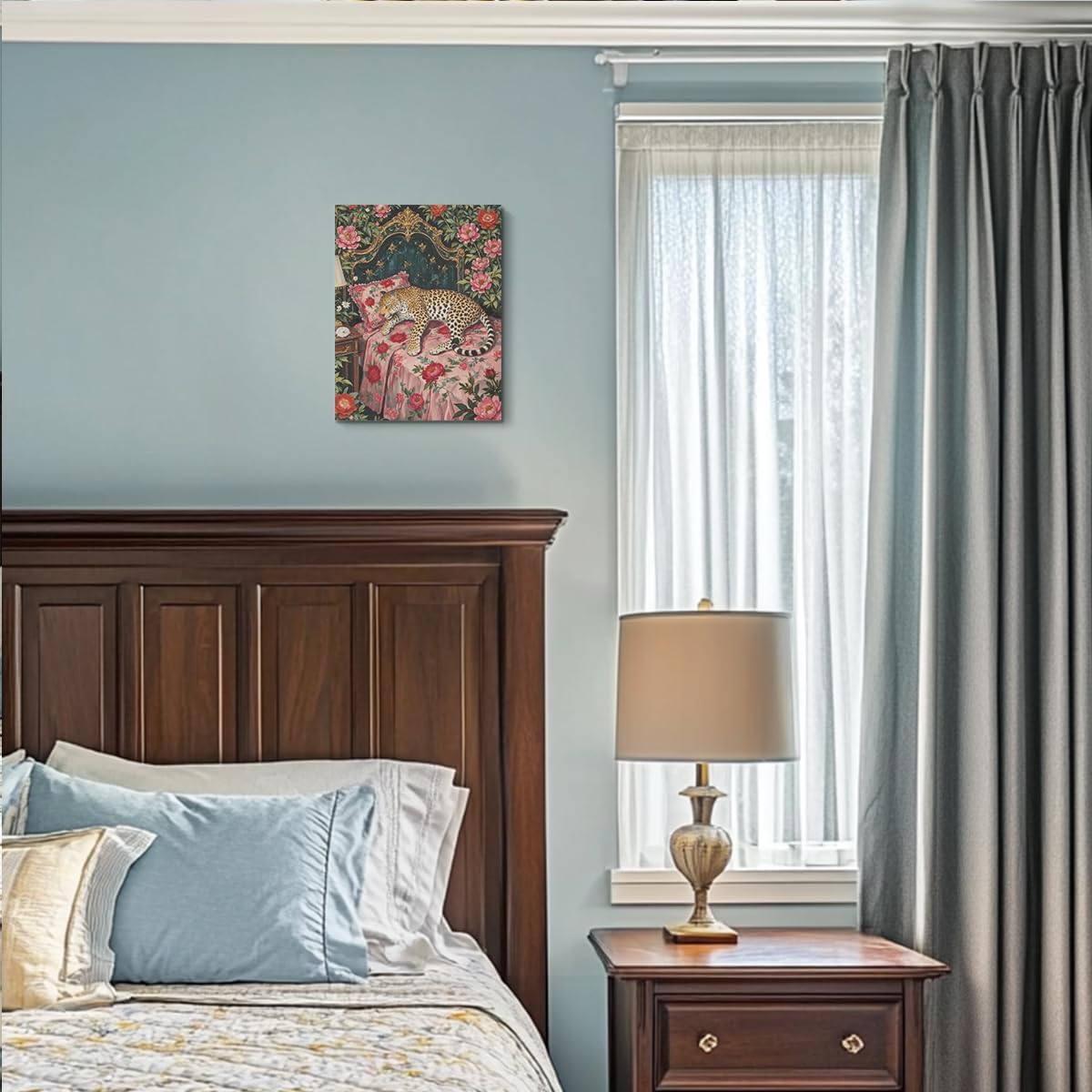 Leopard in Bed Wall Art, Mid Century Vantage Animal Portrait Oil Painting Canvas Framed Prints Modern Decorations, Maximalist Leopard Poster for Bedroom Living Room Entryway Aesthetic