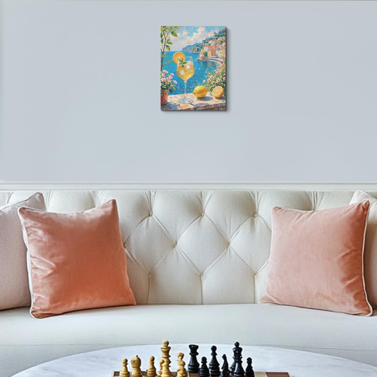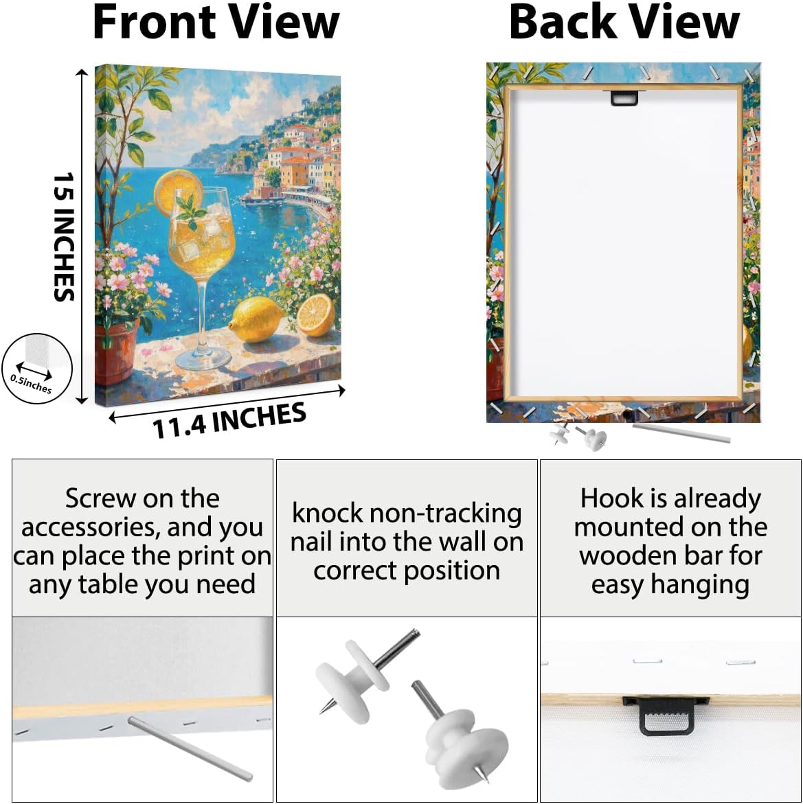 Italy City Wall Art, Coastal Landscape Watercolor Painting Italy Lemon Canvas Framed Prints Modern Decorations, Summer Aesthetic Flowers Poster for Living Room Entryway Farmhouse Bedroom Dining room