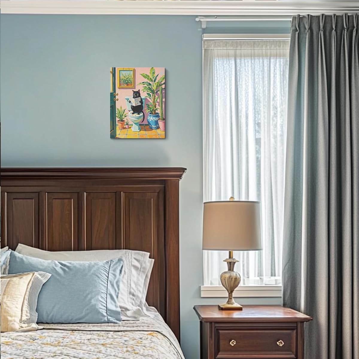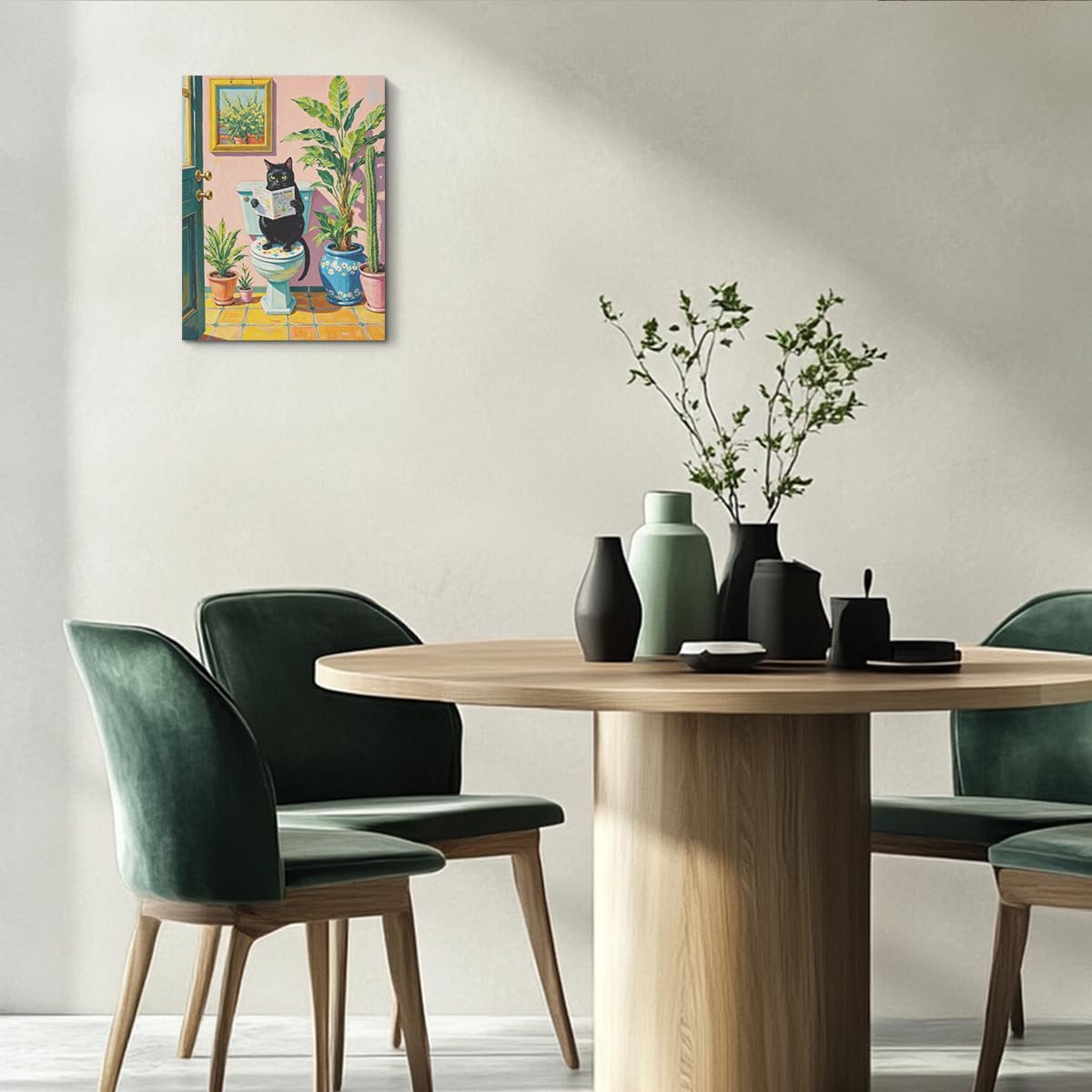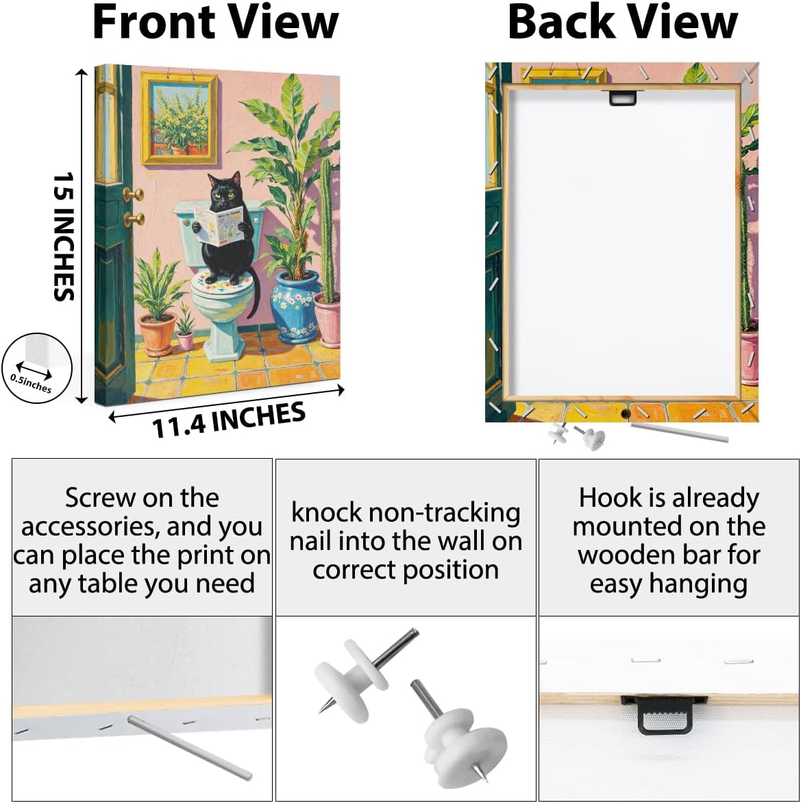 Funny Cat on Toilet Paintings Wall Art, Cat Lover Gifts, Botanical Wallpaper Canvas Framed Prints Modern Decorations, Pink Cute Poster for Living Room Bathroom Entryway Book Shelf Farmhouse