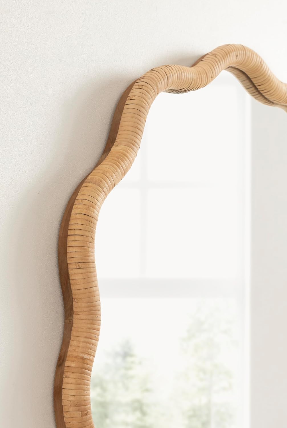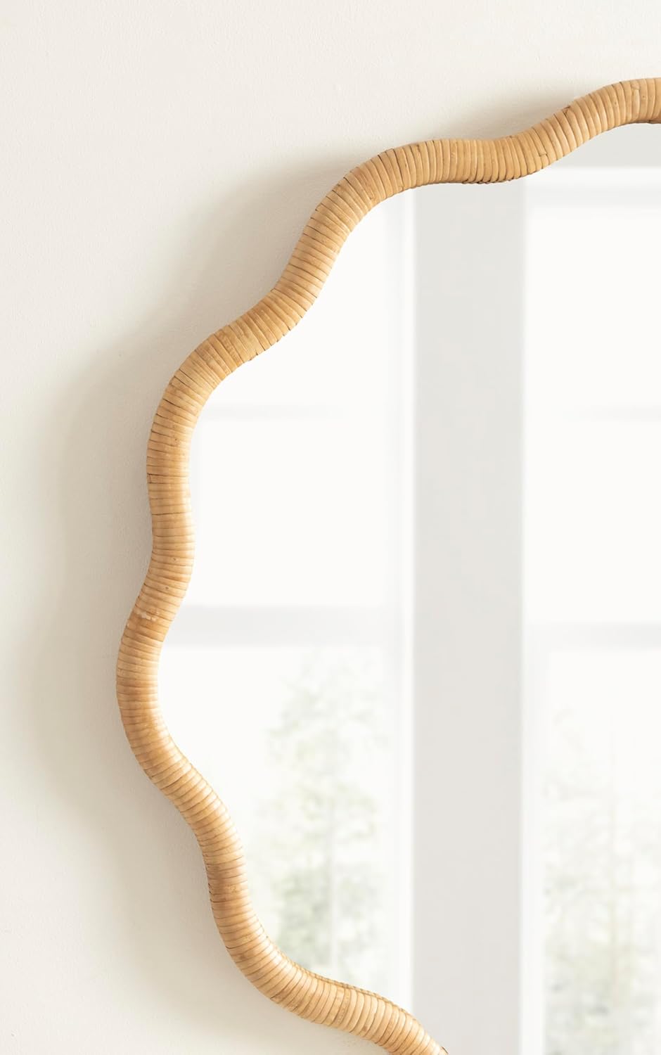 - Modern Mirror Design: The bohemian Rahfy mirror features a lovely scalloped round mirror surrounded by a rattan-wrapped frame with a wavy, textured design