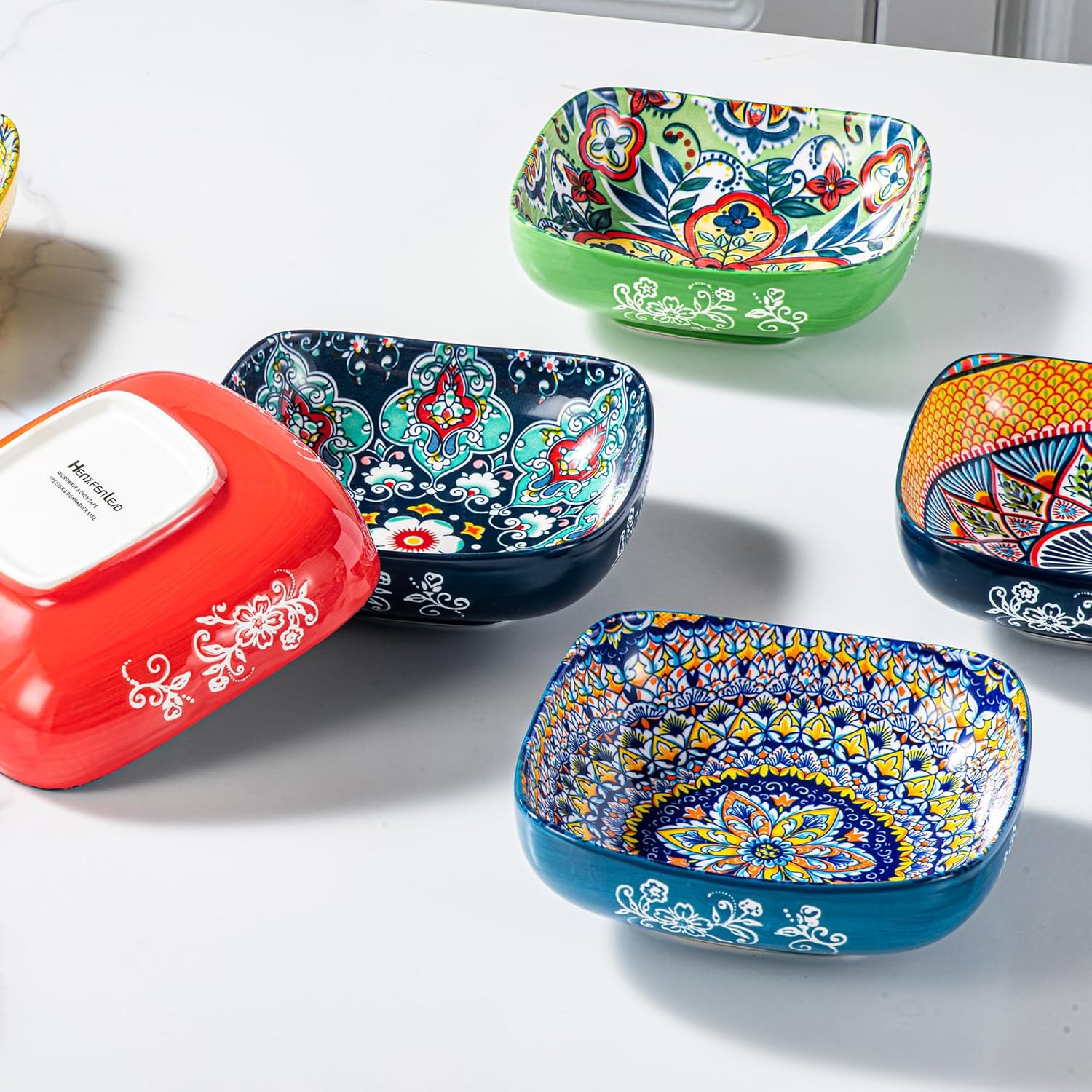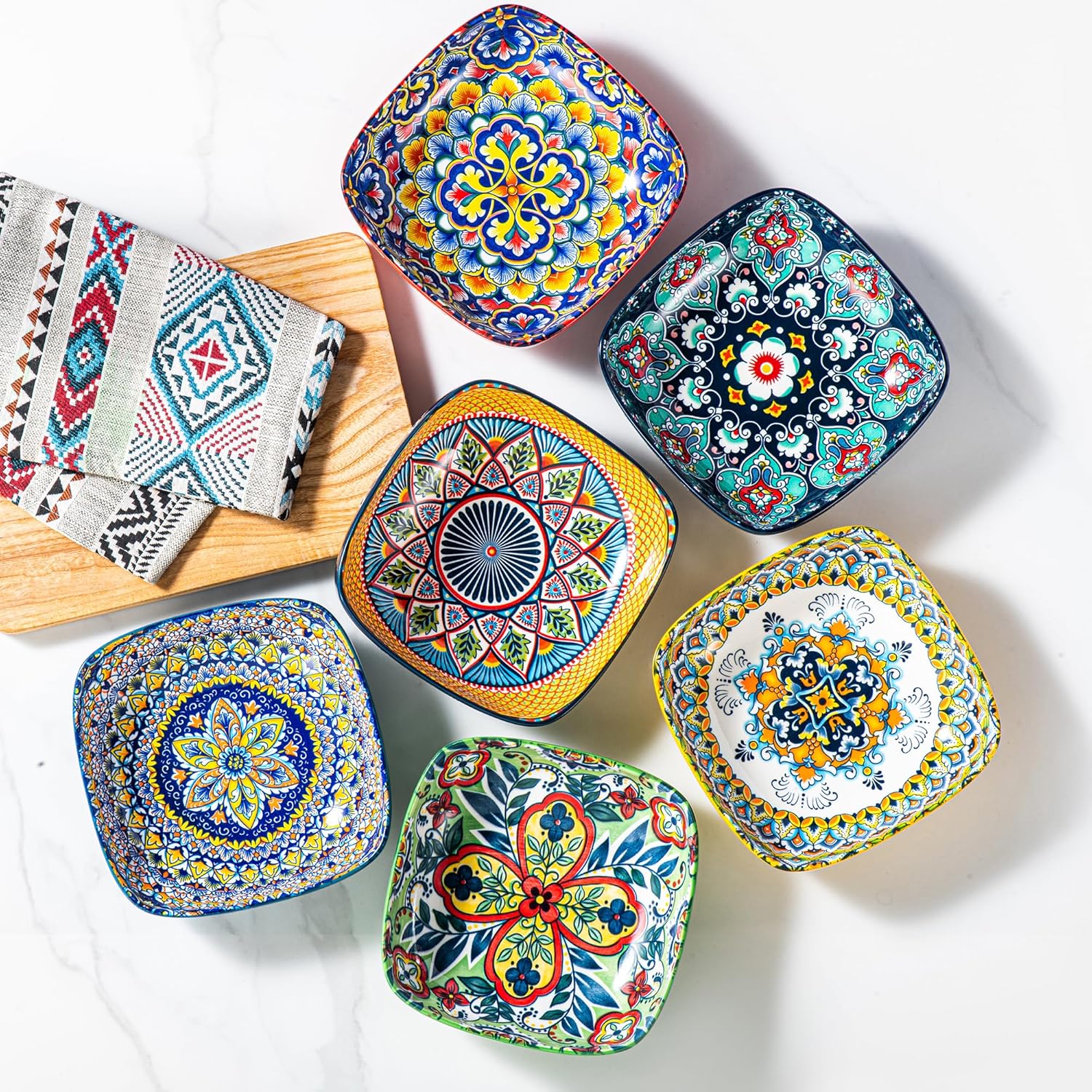 - 【Bohemian Beauty in Every Bite】Add bold color and personality to your kitchen with this set of 6 square ceramic bowls. Each features a unique bohemian-style pattern—ideal for upgrading your kitchen decor or creating an eye-catching table setting for everyday meals or special occasions.
