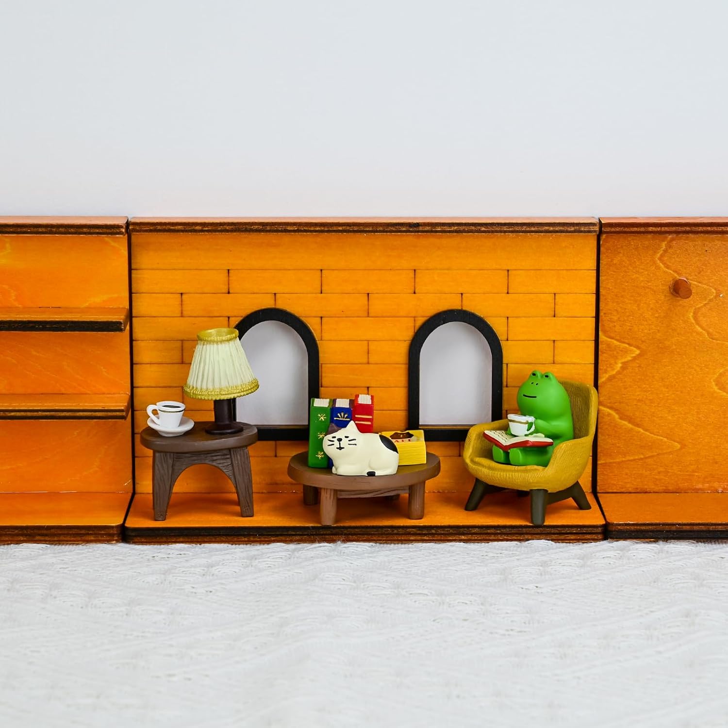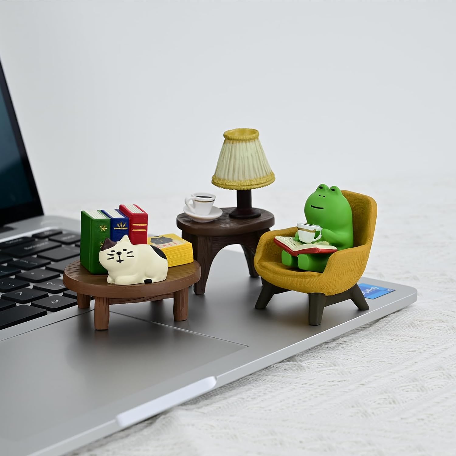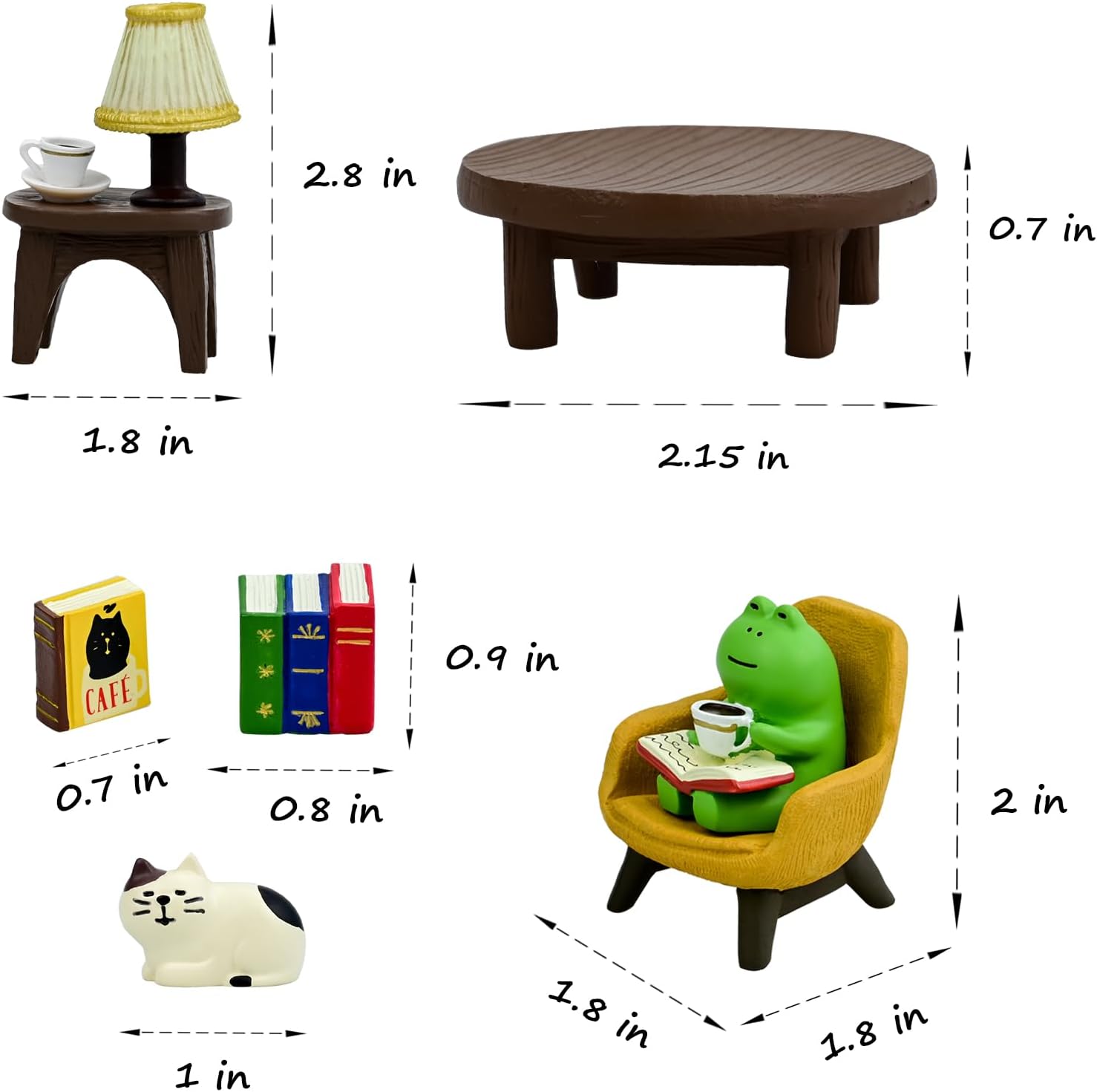 - Cute Desk Accessories: This set of Miniature figurines includes a frog reading and drinking coffee, a little cat, a small round table, a yellow sofa, a lamp table, and a lot of books, totaling 7 pieces as a set