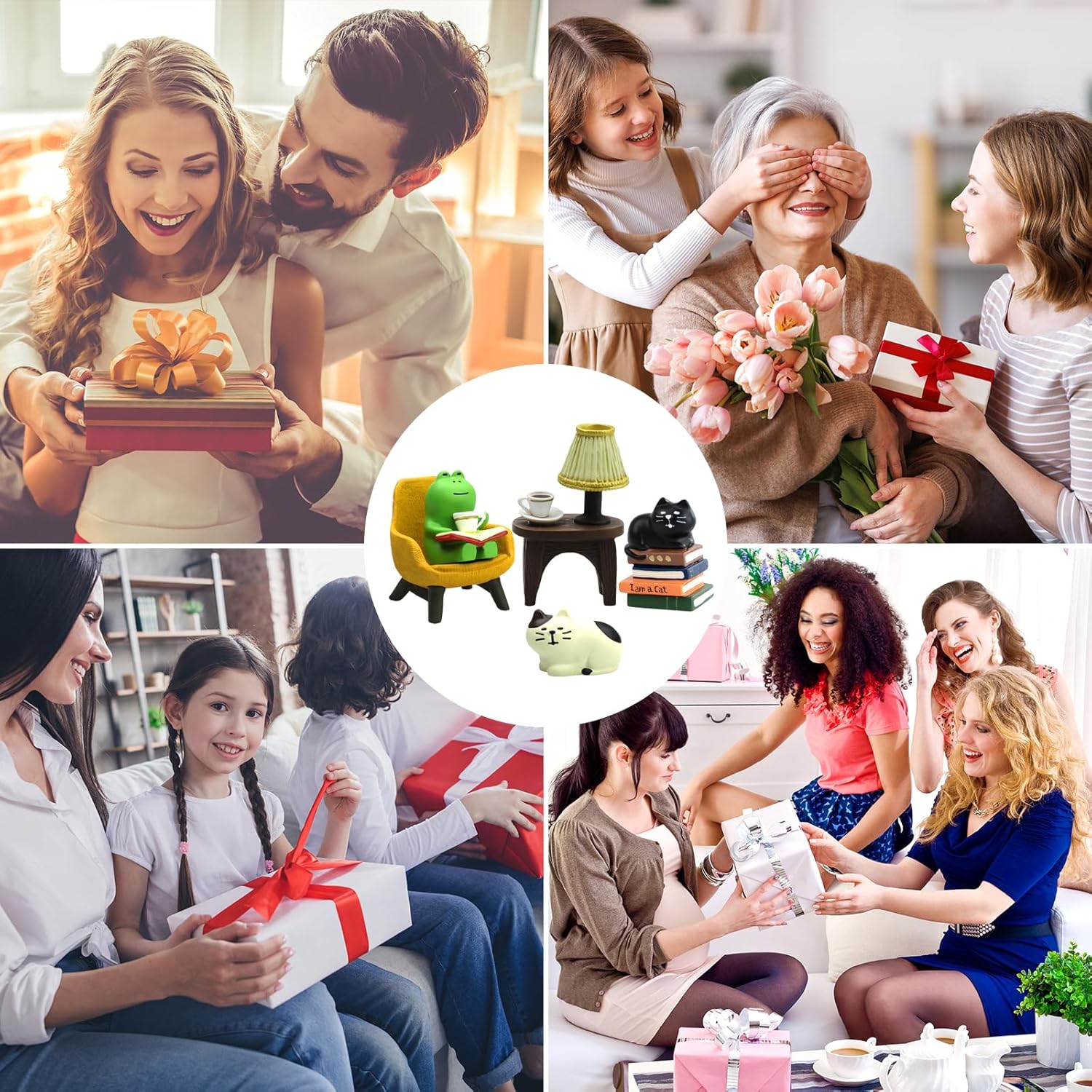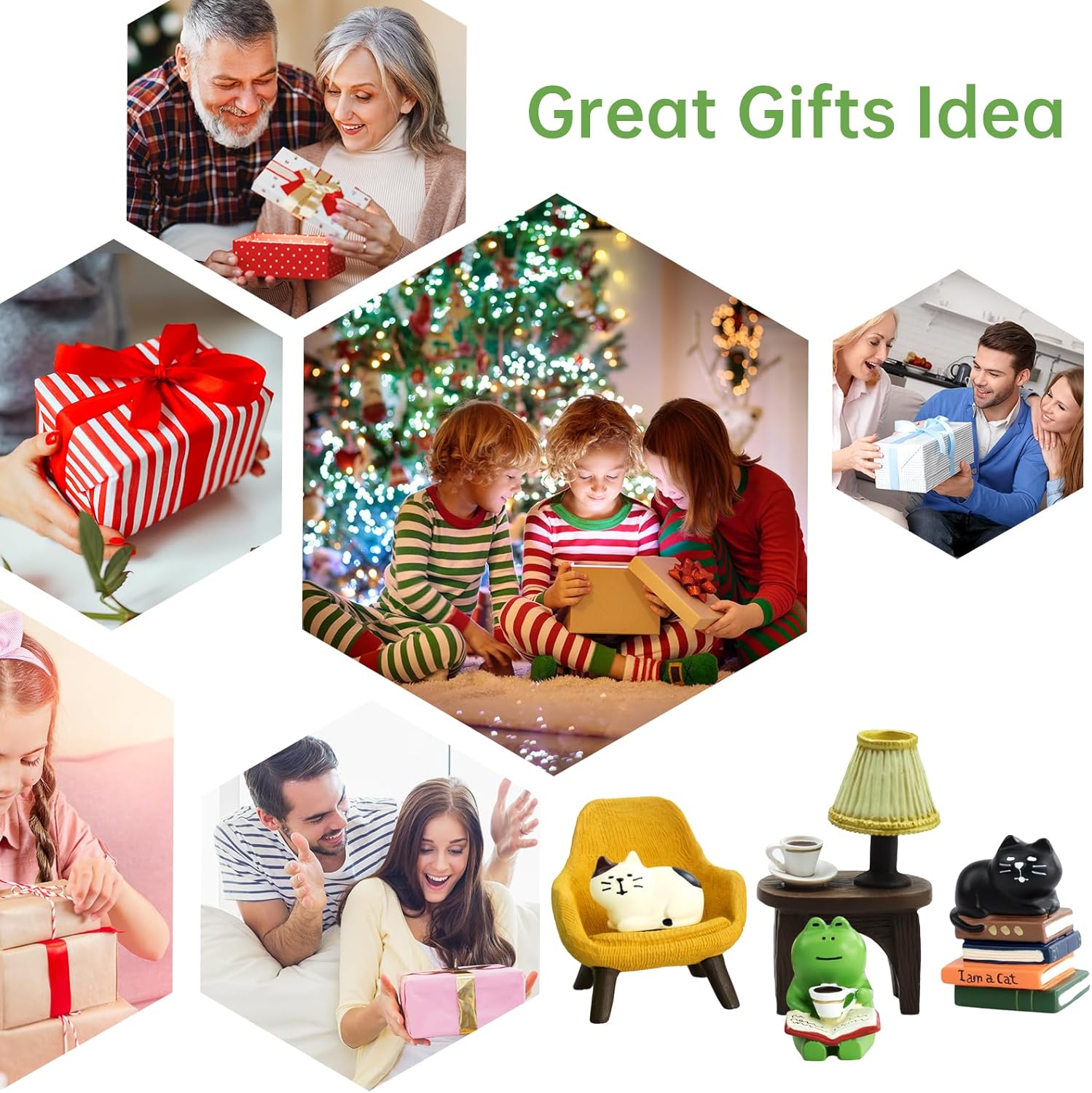 - Cute Desk Accessories: This set of miniature figurines includes one frog, one cat, one yellow sofa, the cat on book, and the lamp table