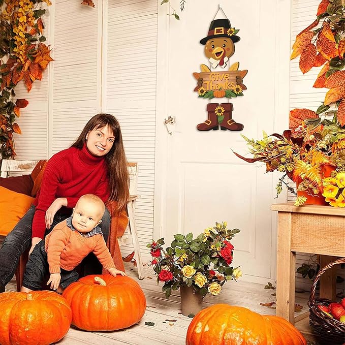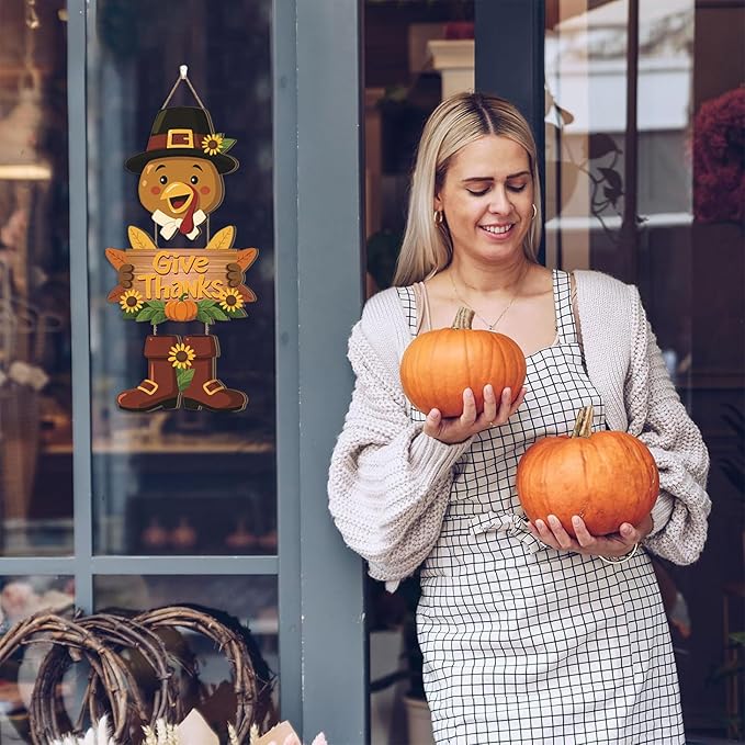 - Turkey Thanksgiving Wooden Wall Decor: The autumn wall decor is designed in an interesting turkey shape. Designed on the wooden board as a turkey holding a 'Give Thank' welcome sign.This turkey door sign will add a autumn atmosphere to your home or bedroom