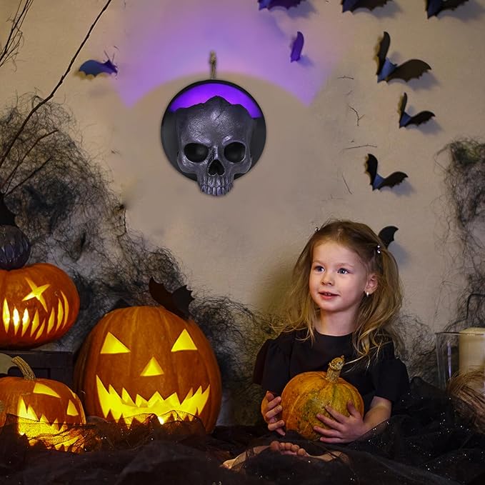 WONDER GARDEN 7.68 inch Halloween Skull Hanging Wall Decorations Light up Resin Purple Gothic Skeleton Halloween Creepy Sculptures for Indoor Outdoor Office Horror Home Wall Decor