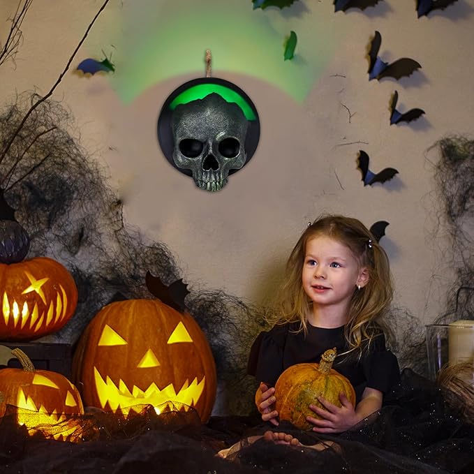 WONDER GARDEN 7.68 inch Halloween Skull Hanging Wall Decorations Light up Resin Green Gothic Skeleton Halloween Creepy Sculptures for Indoor Outdoor Office Horror Home Wall Decor